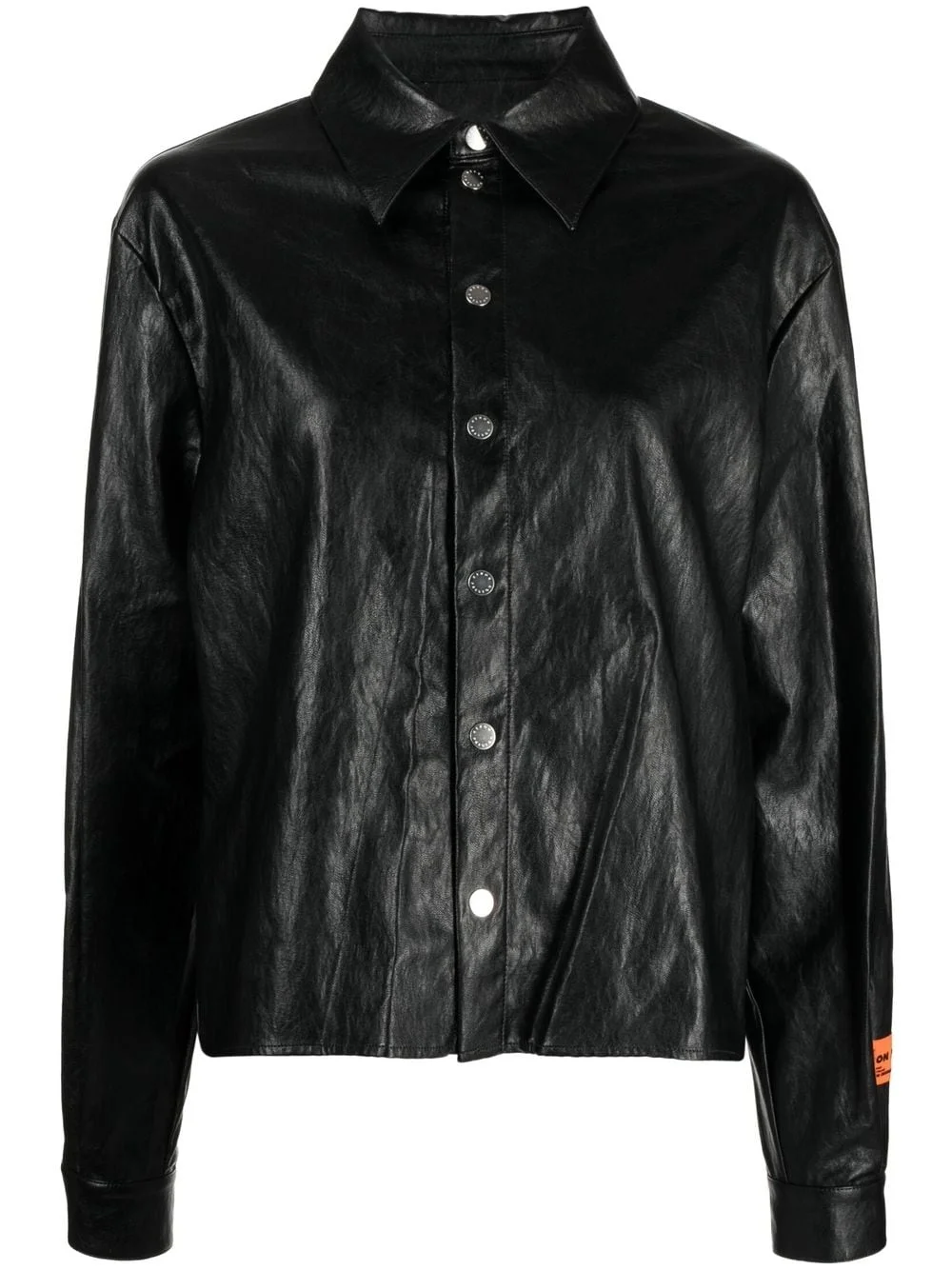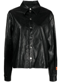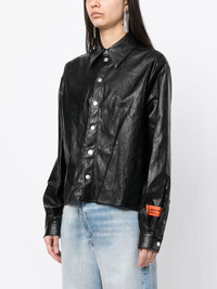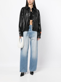 shimmer-finish long-sleeve shirt black shimmer finish classic collar front button fastening logo patch at the sleeve long sleeves buttoned cuffs rear curved hem Made in Italy Composition Polyurethane 63%, Viscose 21%, Polyester 5%, Other fibres 5%, Cotton 4%, Metal 2% SIZE & FIT Model measurements Height 5 ft 10 in(1.78 m) Bust/Chest 33.07 in(84 cm) Hips 33.85 in(86 cm) Waist 25.19 in(64 cm) Washing instructions Machine Wash