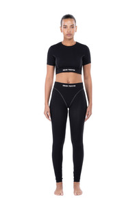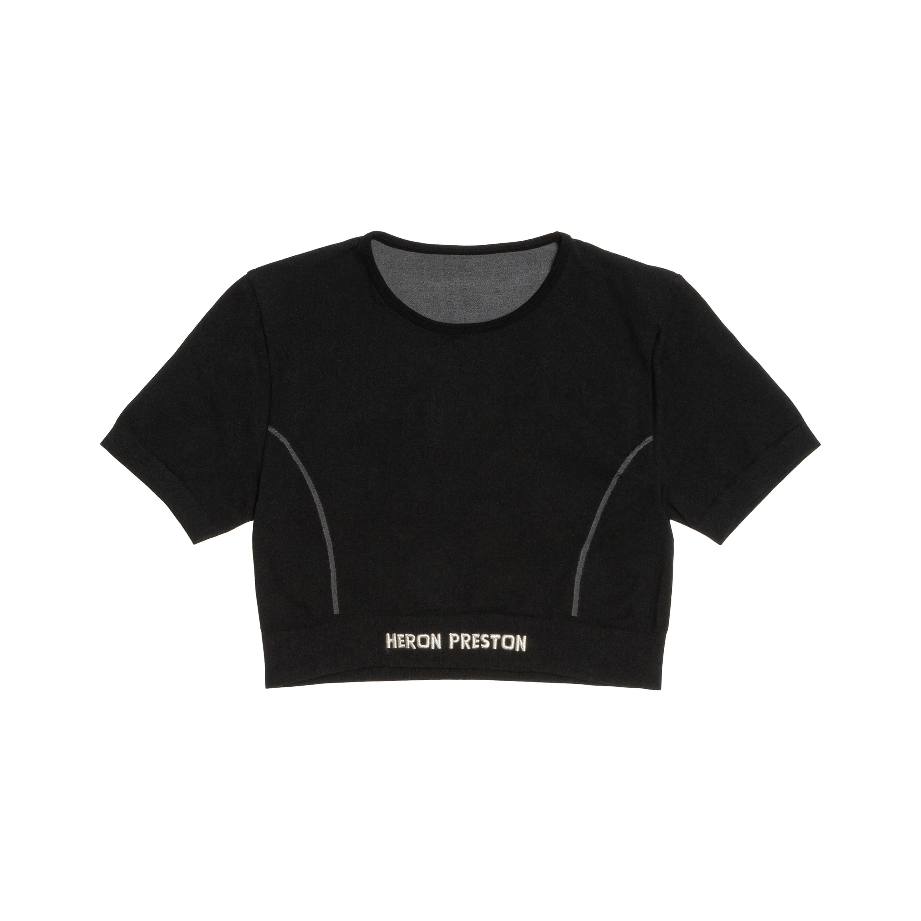 Product Details - Black Short Sleeve Top - 92% Recycled Elastane 8% Recycled Polyamide - Heron Preston silver embroidery in the front - Seamless - Orange label on the back - Cut-away inside care label. No itchy skin. - Made in Italy Fit Nisaa is 5’9” (177cm) and is wearing a size XS-S Care Instructions Machine wash at 30°c or less on reduced cycle / Do not bleach / Do not tumble dry / Iron at low temperature / Do not dry clean