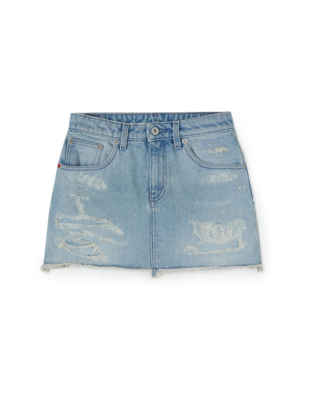 Denim mini skirt in light blue. Orange logo patch at back. Orange lace at waist. 65% Polyester 35% Cotton 100% Cotton Model Daria Dan wears size 40 Height: 5’ 9” 1/2 (176 cm) Waist: 23" 1/2 (60 cm) Hips: 34" 1/2 (88 cm) Product ID: HWYF010F22DEN0024000