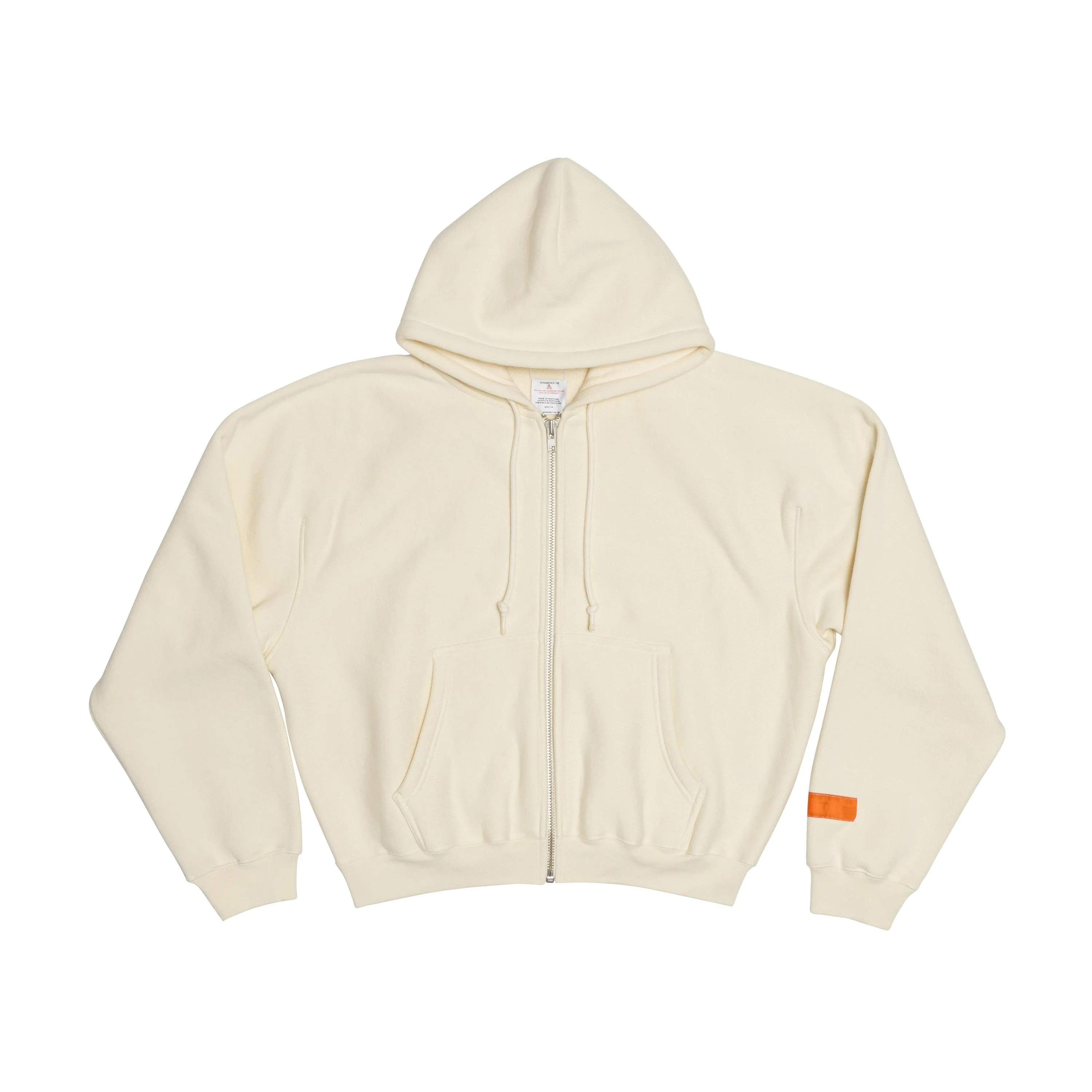 Product Details - Ivory Zip Up Hoodie - 100% Cotton - 580 GSM - Custom "HP" YKK zipper - Orange label on sleeve - Cut-away inside care label. No itchy skin. - Unisex - Made in Portugal Fit Nisaa is 5’9” (177cm) and is wearing a size M Marius is 6’2” (187cm) and is wearing a size L Care Instructions Machine Wash Cold (30°c) / Do Not Bleach / Do Not Tumble Dry / Iron at low temperature Limitations are placed on the addition of water / Mechanical action or temperature during normal dry cleaning process