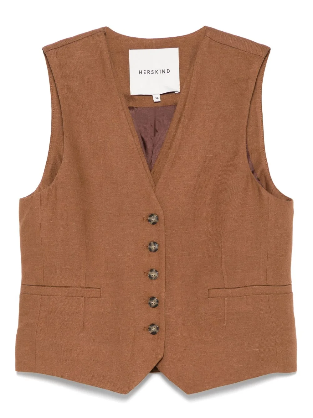 Double Up vest Highlights - Camel brown - Front button fastening - Two front welt pockets - V-neck - Sleeveless Imported Composition Outer: Viscose 73%, Linen/Flax 27% Lining: Acetate 100% Washing instructions Dry Clean Only