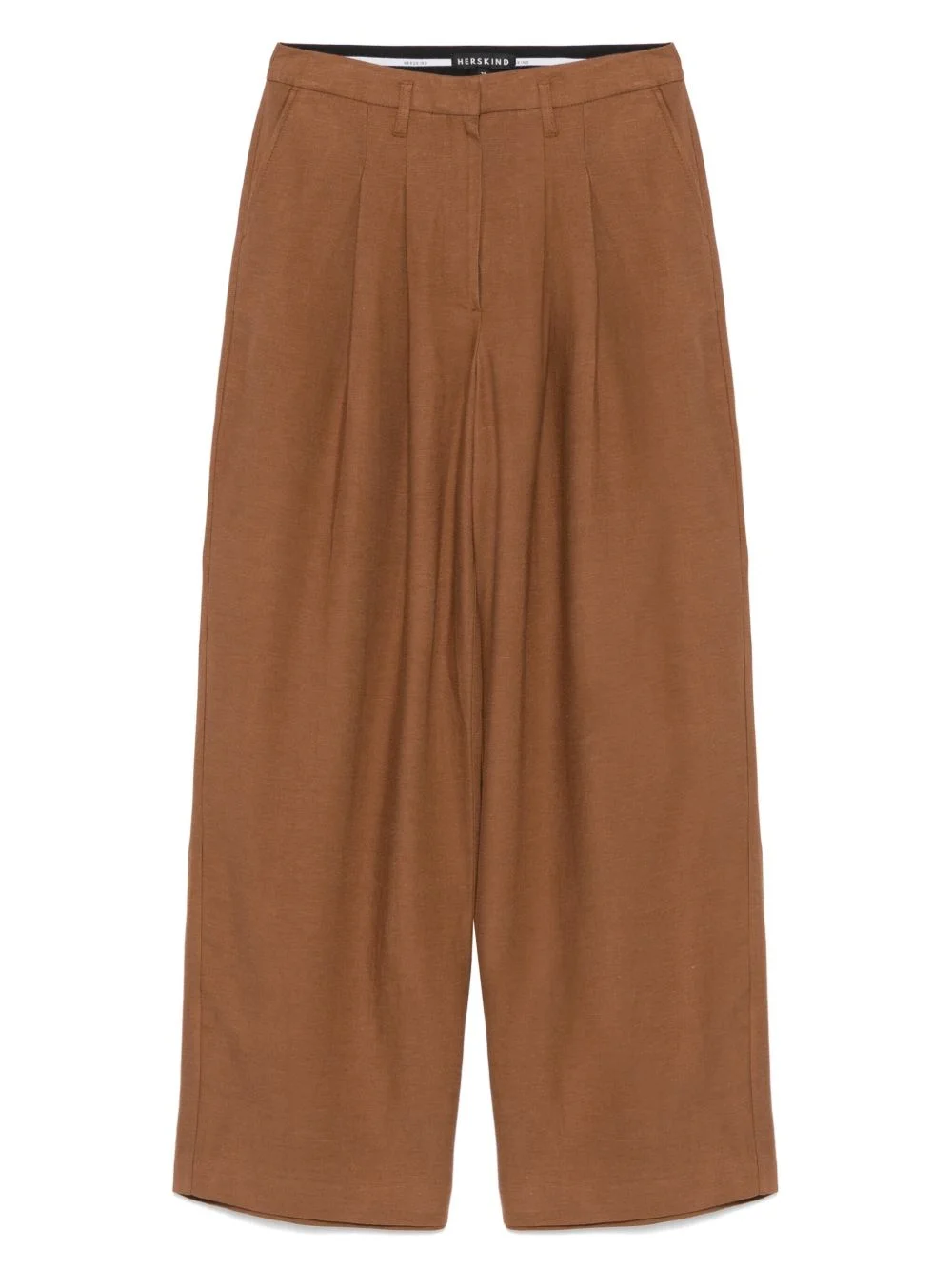 Lotus trousers Highlights - Camel brown - Concealed front button, hook and zip fastening - Two diagonal pockets to the sides - Two rear jetted pockets - Pleat detailing Imported Composition Viscose 73%, Linen/Flax 27% Washing instructions Dry Clean Only