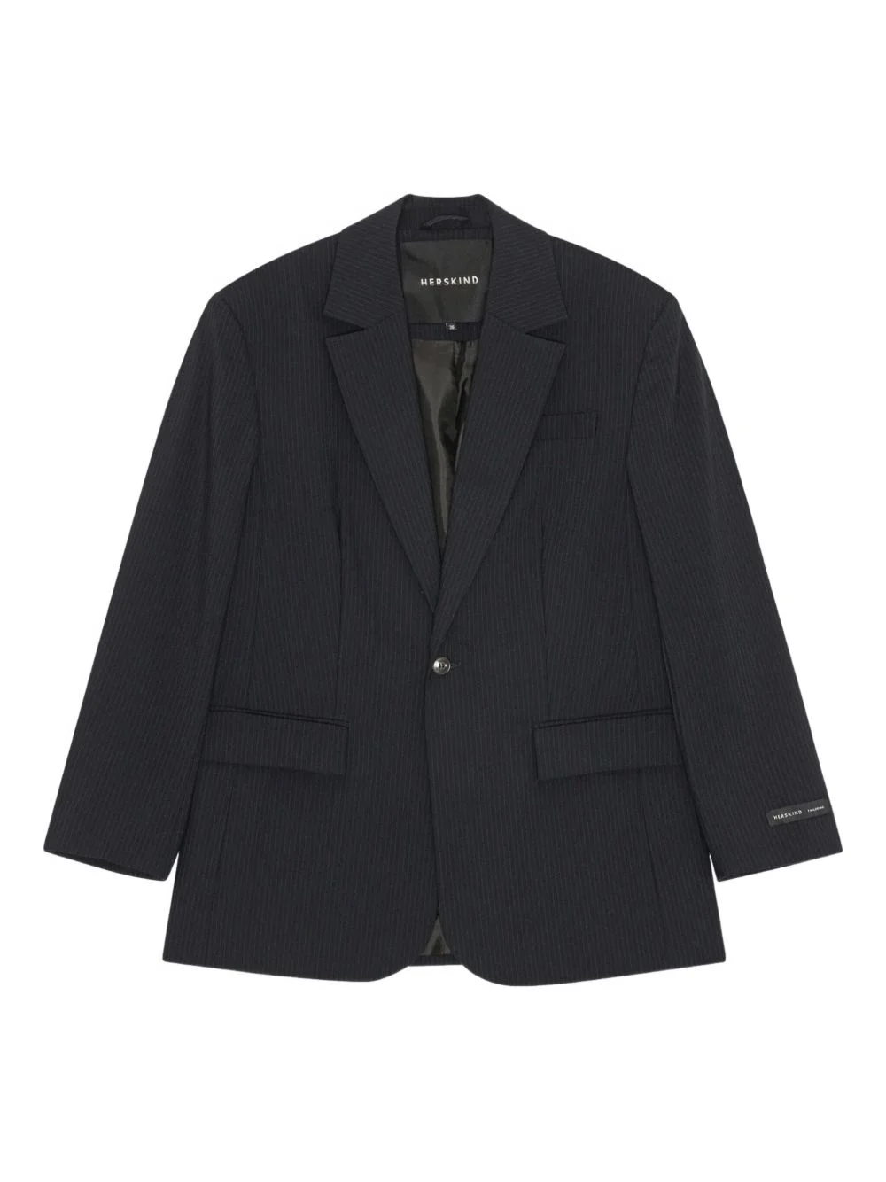 pinstripe single-breasted blazer Highlights - Navy blue - Pinstripe pattern - Single-breasted - Button closure - Notched lapel - Flap pockets Imported Composition Recycled Polyester 53%, Virgin Wool 43%, Spandex/Elastane 4% Washing instructions Read Manufacturer Guidelines