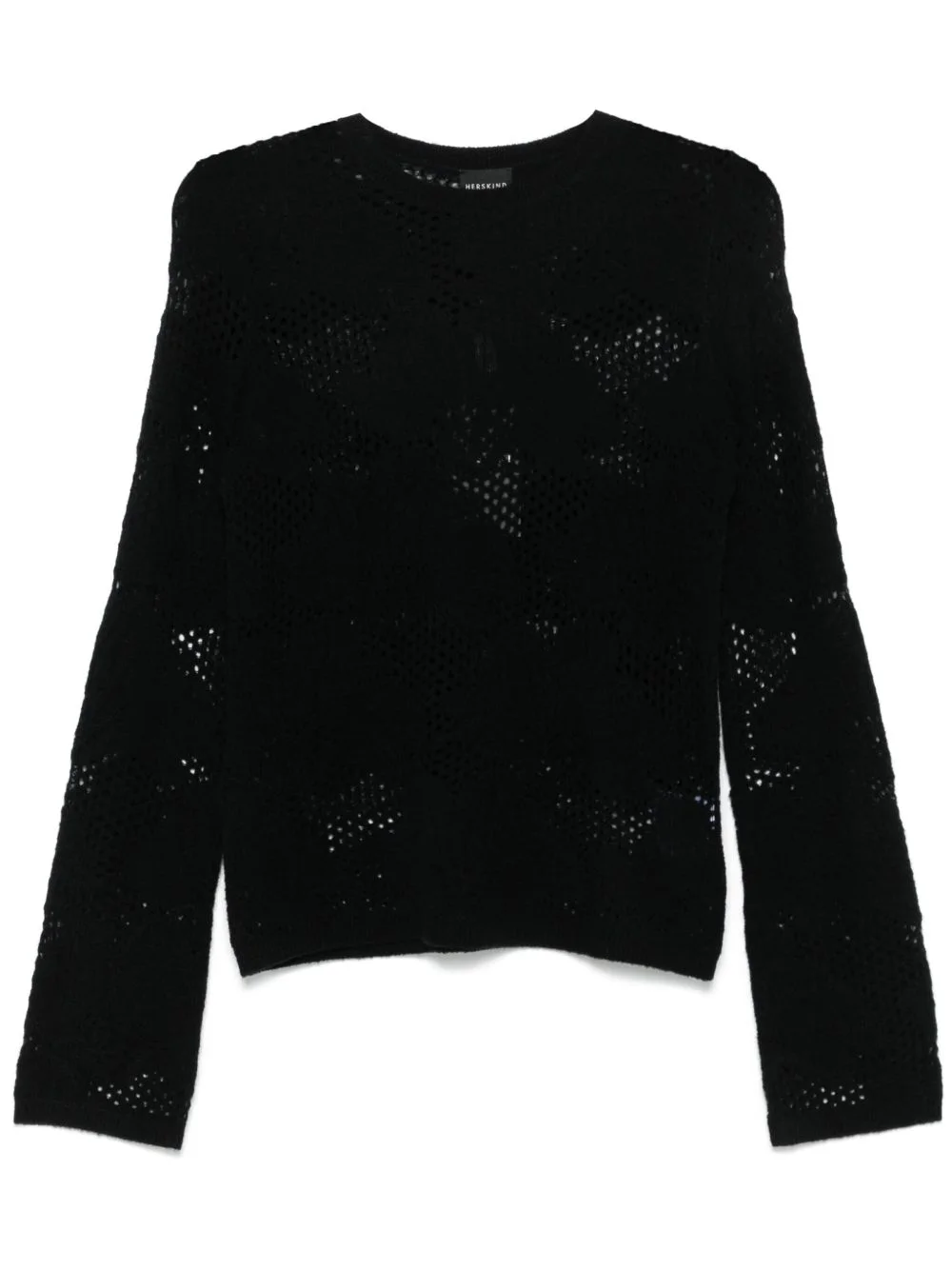 Silvia sweater Highlights - Black - Wool-cashmere blend - Open knit - Semi-sheer construction - Crew neck - Long sleeves - Ribbed cuffs and hem - Straight hem Imported Composition Wool 70%, Nylon 25%, Cashmere 5% SIZE & FIT Model measurements Height 5 ft 9 in(1.75 m) Bust/Chest 34.64 in(88 cm) Hips 36.61 in(93 cm) Waist 26.37 in(67 cm) FittingInformation Designed for a slim fit that sits just away from the body offering a close yet comfortable fit Made from a lightweight stretch fabric, this piece offers elasticity and flexibility when worn