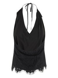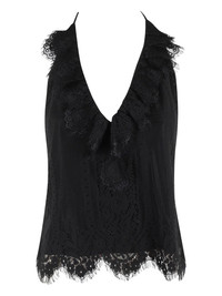 Tina top Highlights - Black - Halterneck tie fastening - Ruffled trim - Open back - Scallop hem Imported Composition Nylon 53%, Cotton 47% Washing instructions Read Manufacturer Guidelines