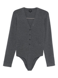 V-neck bodysuit Highlights - Grey - V-neck - Front button placket - Long sleeves - Tonal stitching - Just a reminder that this piece must be tried on over your own garments. Imported Composition Merino 95%, Spandex/Elastane 5% Washing instructions Read Manufacturer Guidelines