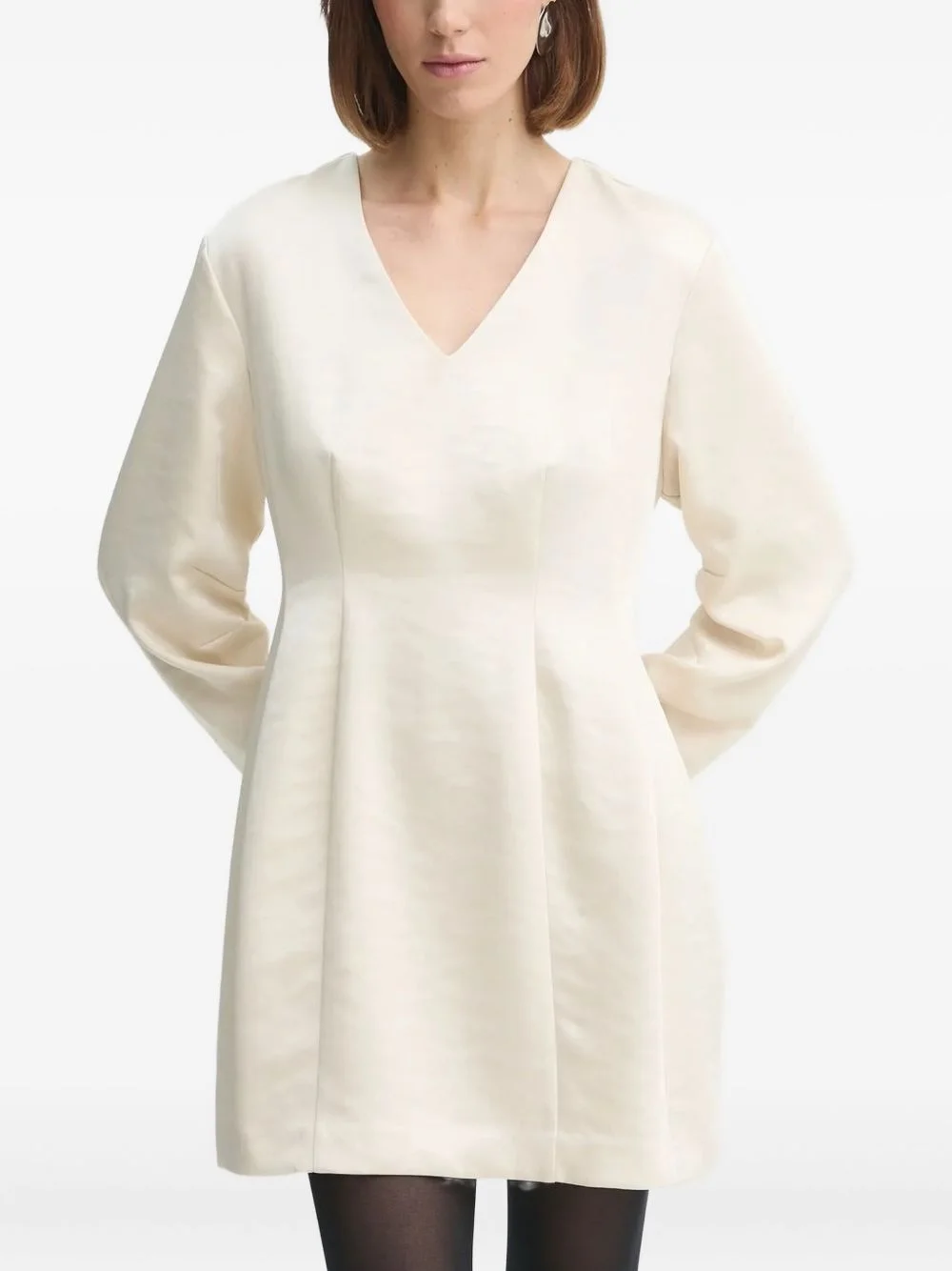 v-neck pleated dress Highlights - Beige - V-neck - Long sleeves - Pleated skirt - Rear zip fastening Imported Composition Polyester 100% Washing instructions Read Manufacturer Guidelines