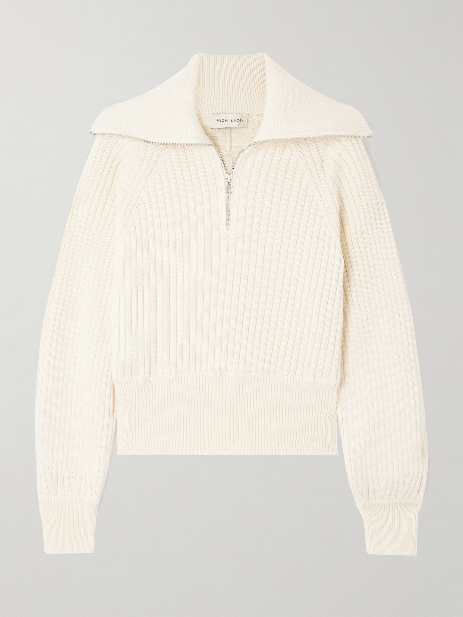 High Sport's 'Chester' sweater is made from weighty cotton-blend and has a chunky ribbed finish to add to its cozy feel. The shawl collar lays comfortably on your shoulders and can be adjusted by the zip fastening. Size & Fit - Fits true to size, take your normal size - Designed for a slim fit - Weighted knit - Model is 177cm/ 5'10" and is wearing a size Small Model measurements: - Bust: 79cm/ 31" - Waist: 61cm/ 24" - Hip: 89cm/ 35" Details & Care - Ivory cotton-blend - Zip fastening along front - 80% cotton, 19% polyester, 1% elastane