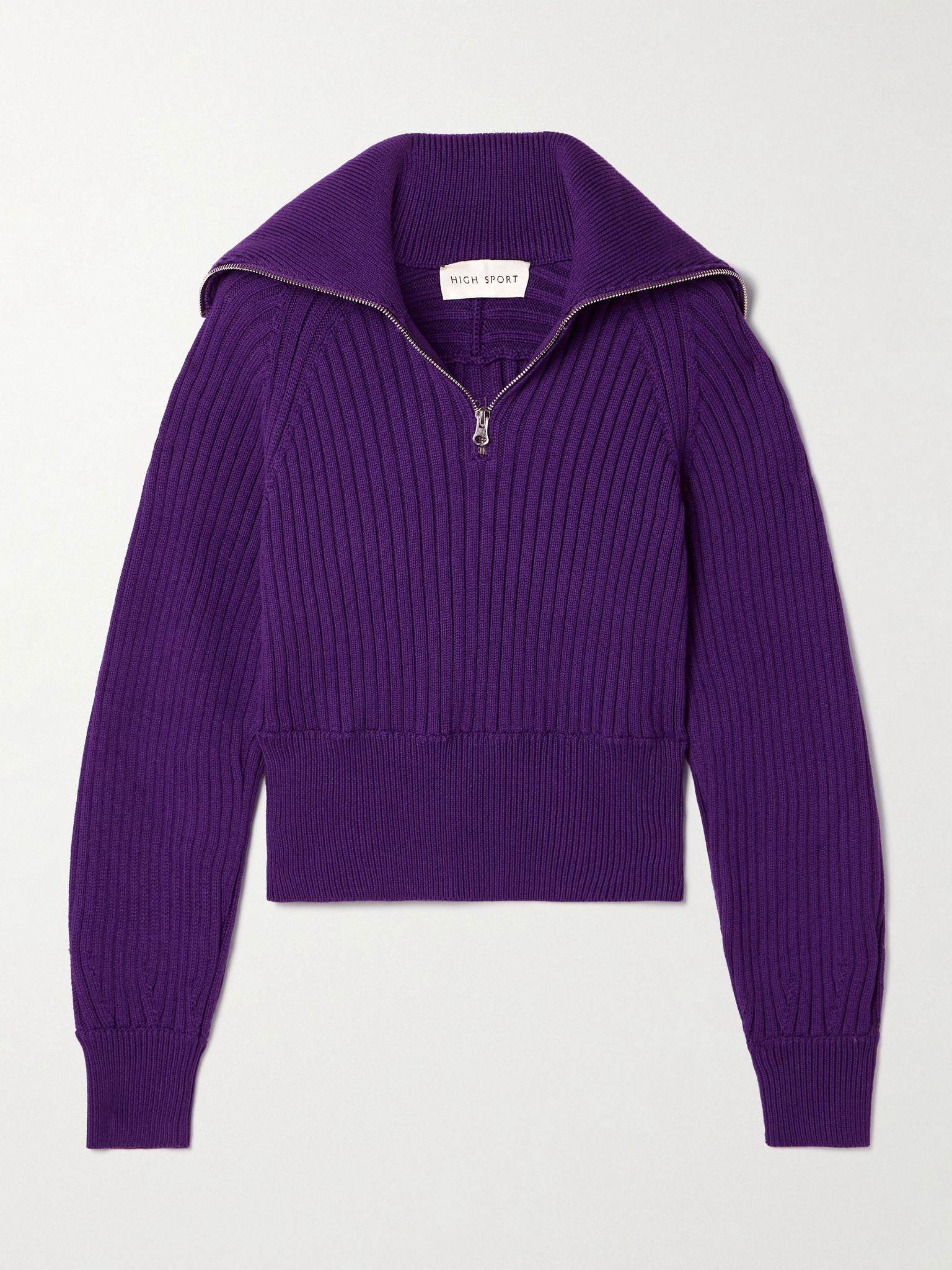High Sport's 'Chester' sweater has been knitted in Italy from a rich cotton-blend - the chunky, ribbed stitch only enhances its cozy feel. It has a slightly loose shape and a half-zip placket that you can style as a funnel neck or undone, depending on the weather. Size & Fit - Fits true to size, take your normal size - Designed for a slightly loose fit - Mid-weight knit - Model is wearing a size Small Details & Care - Purple cotton-blend - Zip fastening along front - 80% cotton, 19% polyester, 1% elastane - Hand wash