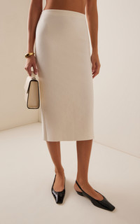 The hyper-considered essentials by Alissa Zachary are tailored from her special signature fabric: a French lycra and soft Italian cotton-blend knit that flatters with a clean finish—and can stand up to the busiest of days. The 'Petra' skirt has a classic pencil silhouette made from a subtle checked jacquard. PRODUCT DETAILS - Resort '25 - Pull on - Composition: 68% cotton, 28% polyamide, 4% Lycra - Designer color: Ecru - Dry clean - Made in the USA SIZE & FIT - Designed for a slim fit