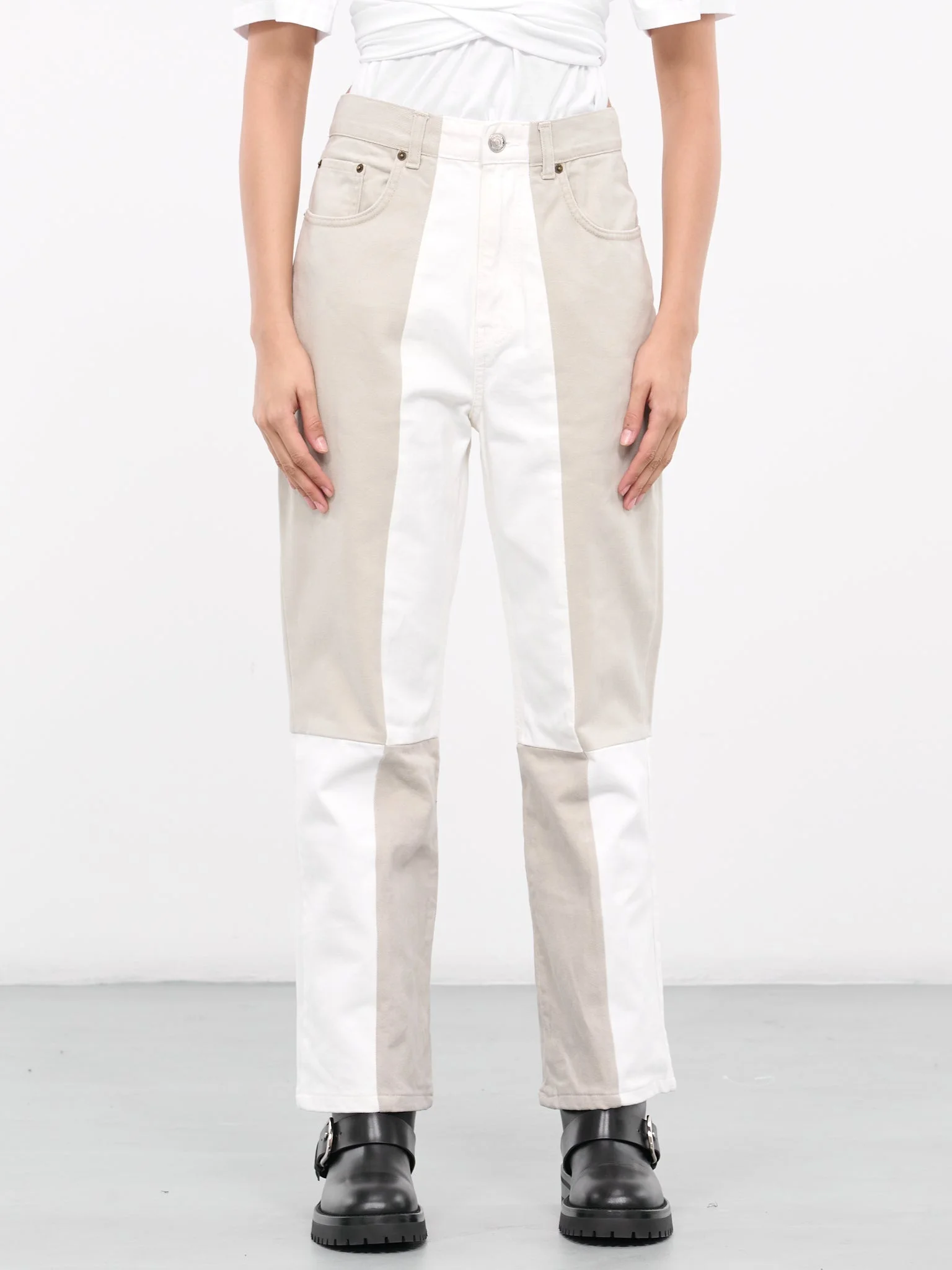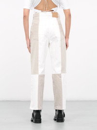 HODAKOVA beige & white trousers, paneled denim construction, belt loops, button & concealed zip fly, back logo jacron, inset pockets, back asymmetric patch pockets, tapered leg, slim fit. Made in Sweden 100% Cotton Standard Sizing Model is 5'8" wearing size S. Bust: 32" Waist: 26" Hips: 34.5"