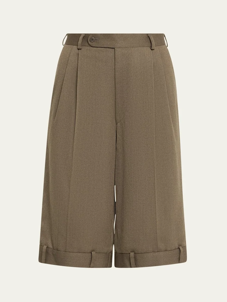 HODAKOVA Bermuda shorts made from re-worked suit trousers with an upside-down trompe l'oeil effect High rise Double pleated front Angled side slip pockets Back button-welt pockets Wide legs Knee length Button-tab/zip fly; belt loops Wool/polyester Made in Sweden Online Inquiries: BGS21_B9VAU| Store Inquiries: #4980971