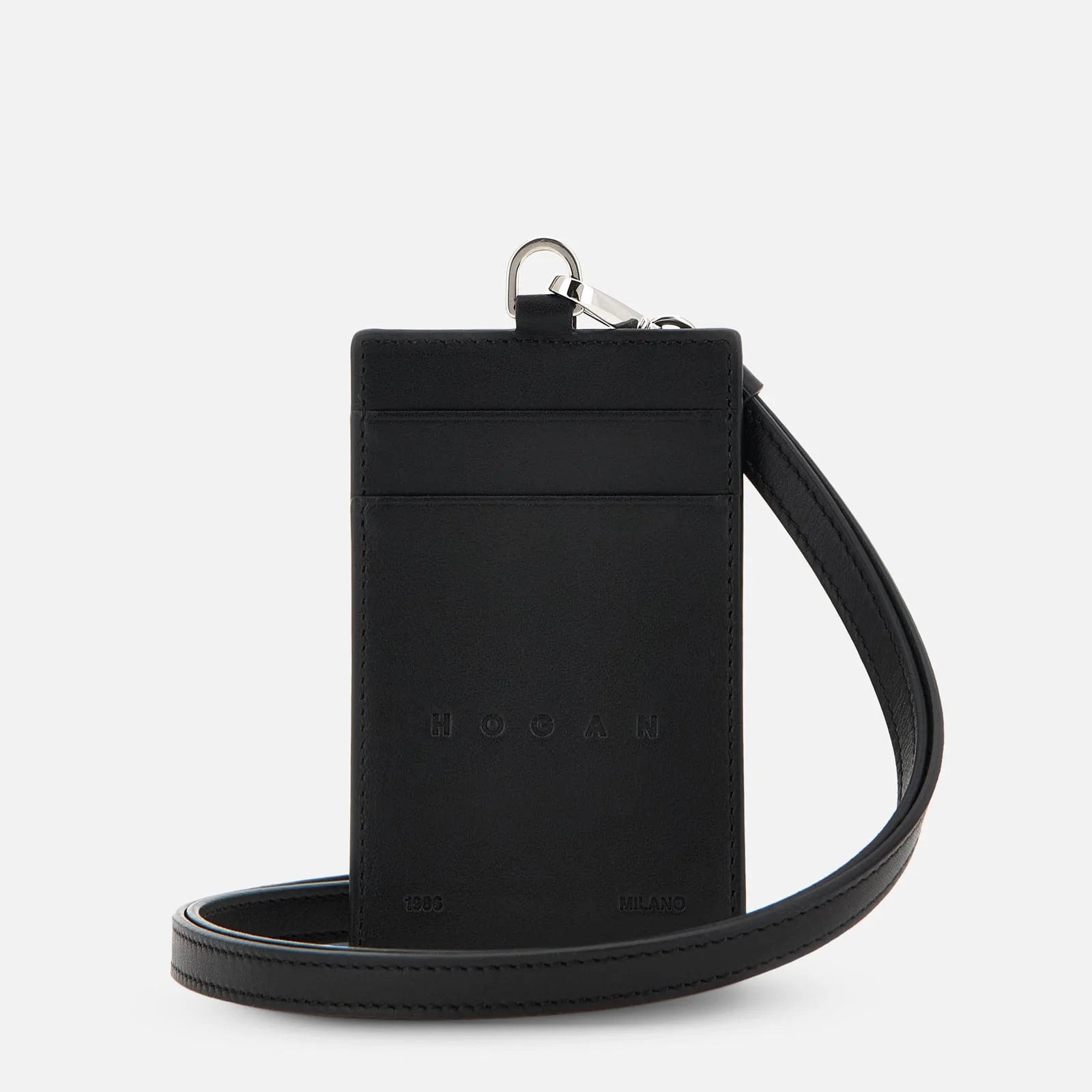 - Women's Hogan badge holder - Made in Italy - Item crafted in leather - Stamped Hogan logo - 1 cardslot on the front - 2 cardslots on the back - Removable lanyard with snap hook - Maintenance and care cards included Badge holder in leather with stamped Hogan logo and removable lanyard.