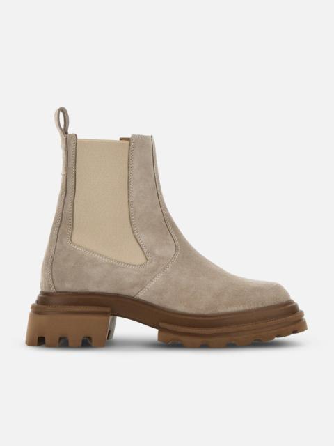 - Women's Hogan 10-Storey Chelsea Ankle Boots - Suede upper - Side elastic inserts - Soft insole 0.2 ins - EVA outsole - Total height 2.2 ins - Maintenance and care cards included - Fabric dustbag included Epitomizing modern urban aesthetics and attitudes, these Chelsea ankle boots come with a workwear-inspired, and a new extralight signature split-sole. Crafted in suede, they feature an upper with essential line, side elastic inserts and an eyelet on the back. Complemented by a soft insole, they are a bold model for your everyday look.