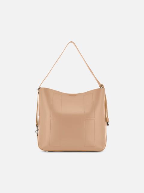 - Women's hobo bag - Item crafted in leather - Hogan logo stamped on the front and side - H charm pendant - Dimensions: 16.1 x 12.8 x 5.7 ins - Adjustable versatile shoulder strap - Magnetic button closure - Internal removable pouch - Metal feet - Maintenance and care cards included - Fabric dustbag included Finished with distinctive stitching outlining a maxi H, this rectangular hobo bag features the Hogan logo stamped on the front and a metal H charm on the side, covered in leather. Crafted in soft leather, it can be worn in versatile ways: crossbody, over the shoulder in a classic way, sideways as a bucket bag effect, or by hand and under the arm, folded up. A creation with an ever-changing twist, complemented by a practical pouch.