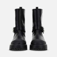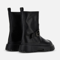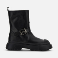 - Women's Biker Ankle Boots - Made in Italy - Smooth leather upper - Branded metal H accessory - Memory foam insole 0.2 ins - EVA outsole - Total height 2 ins - Maintenance and care cards included - Fabric dustbag included New must-have for contemporary urban style, these biker ankle boots are characterized by a lugged outsole with milleraies detailing. Designed for optimal grip, the tread comes with external H-shaped blocks. The military-inspired style, emphasized by exposed stitching, is balanced by the essential taste of the lines. The prominent toe and heel add character and three-dimensionality to the smooth leather upper, enhanced by a strap with branded metal H accessory. The memory foam insole guarantees a cushioned fit. MOD. HXW6190FC40KXTB999