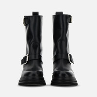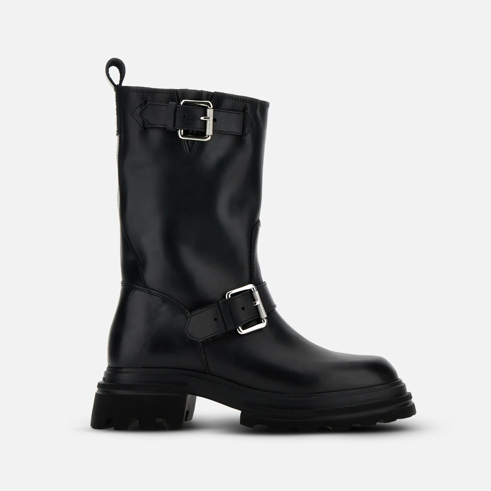 - Women's Hogan 10-Storey Biker Boots - Smooth leather upper - Buckle on the boot leg and instep - Soft insole 0.2 ins - EVA outsole - Total height 2.2 ins - Maintenance and care cards included - Fabric dustbag included Epitomizing modern urban aesthetics and attitudes, these Chelsea ankle boots come with a workwear-inspired, and a new extralight signature split-sole. Crafted in smooth leather, they feature an upper with essential line, two metal buckles and an eyelet on the back. Complemented by a soft insole, they are a bold model for your everyday look.