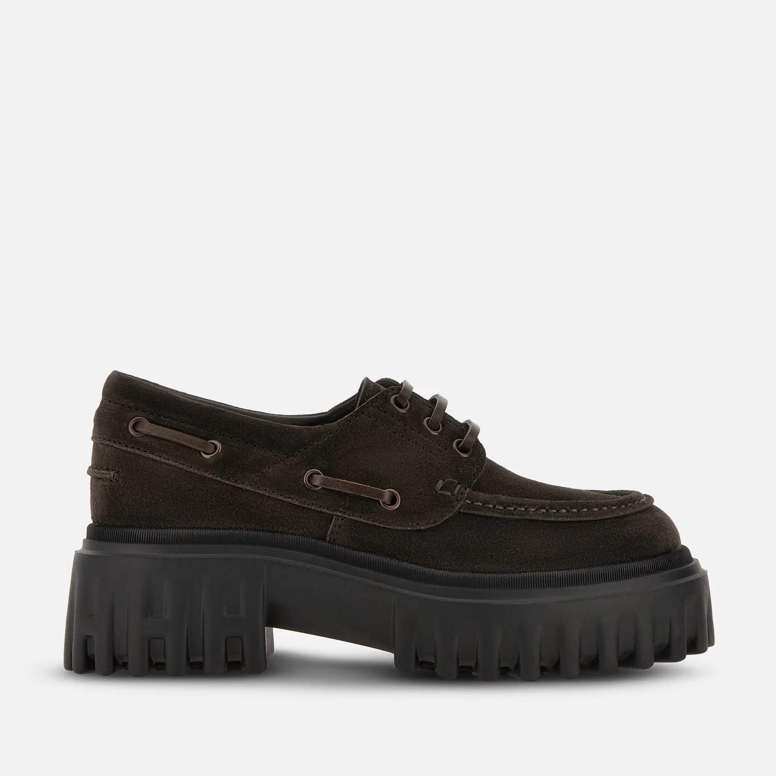 - Women's Hogan H700 Boat Shoes - Made in Italy - Suede upper - Woven tie - Leather lining - Memory foam insole 0.3 ins - Rubber outsole - Total height 3 ins - Maintenance and care cards include - Fabric dustbag included The Hogan H700 is a statement chunky design construction, fusing oversize H branding into the iconic H-Stripes sole. This boat shoe, with distinctive woven tie, is crafted in suede. A juxtaposition of rugged performance and urban chic, with a comfortable memory foam insole.