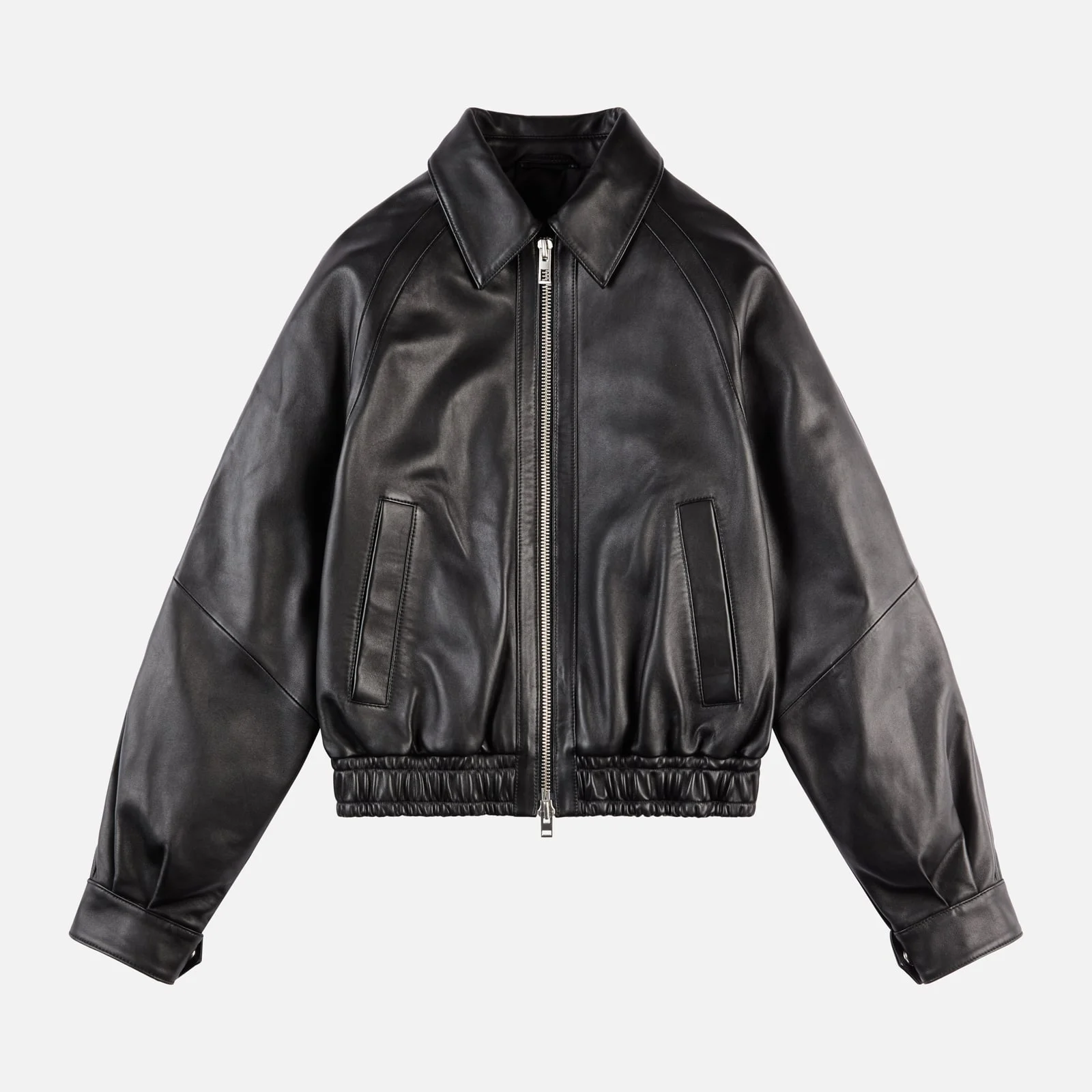 - Bomber jacket in nappa leather - Fitting: regular - Item composition: 100% ovine nappa leather, lining 100% polyester, sleeve lining 100% polyester - Maintenance and care cards included Bomber jacket crafted in soft nappa leather, with welt pockets and elastic bottom hem. Characterized by raglan sleeves with angled stitching, it comes with a zip fastening, cuffs with strap and covered snap.