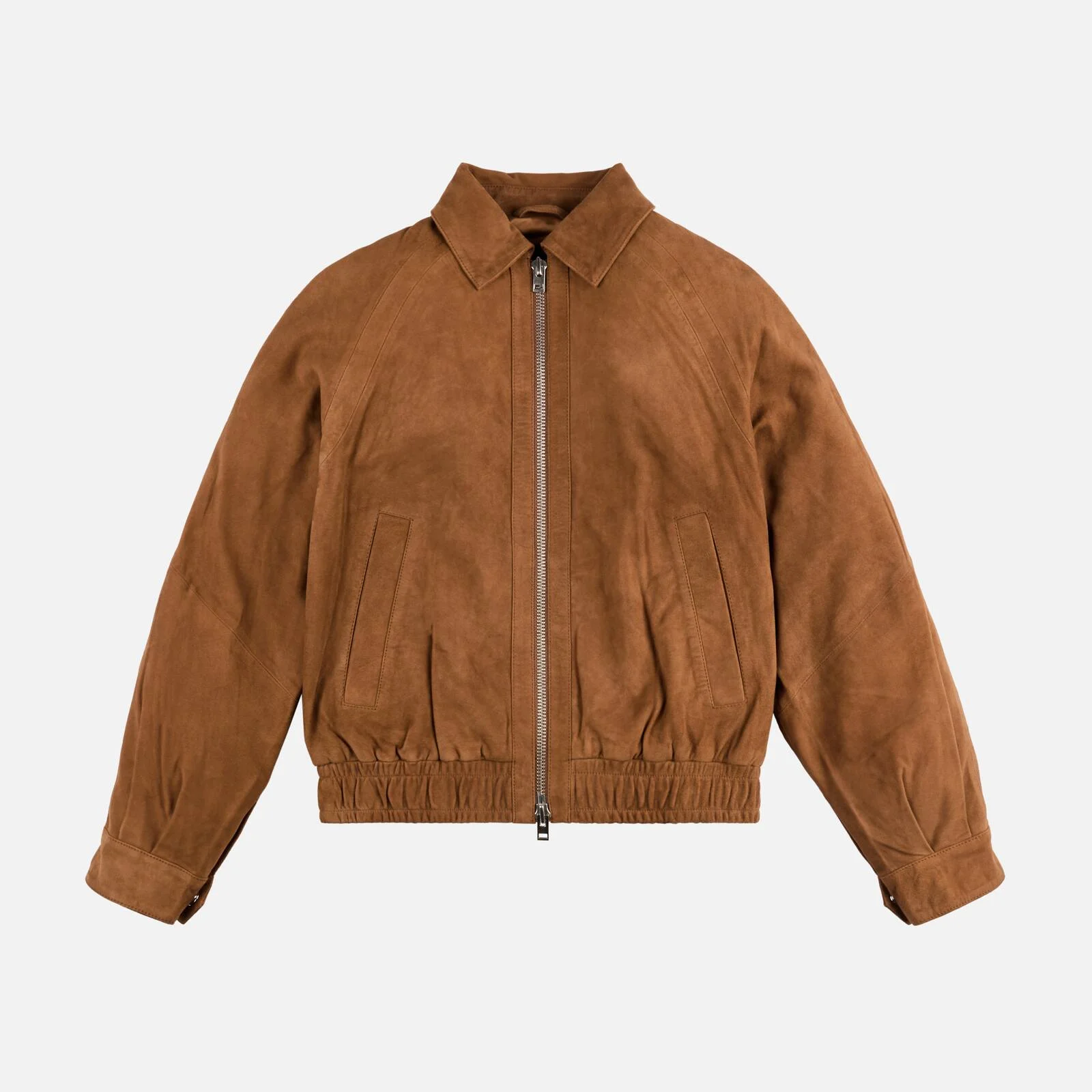 - Women's bomber jacket - Fitting: regular - The female model is 5' 9'' and wears size S (IT) - Item composition: 100% goatskin leather, lining 100% polyester, sleeve lining 100% polyester - Maintenance and care cards included Raglan-cut bomber jacket in soft suede, with welt pockets and elastic bottom hem. Characterized by a shirt collar and cuffs with covered snaps, it features a practical double-slider zip.