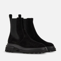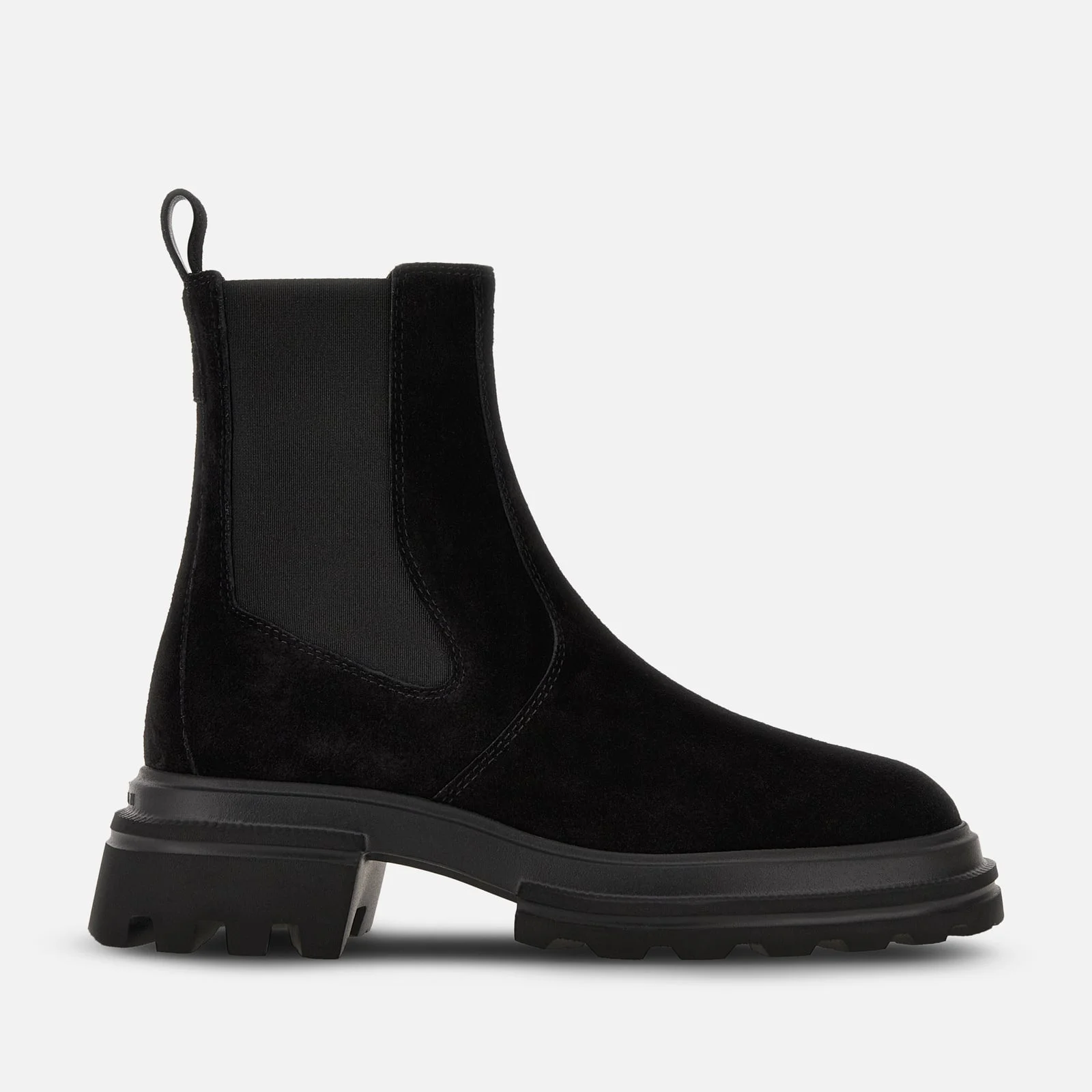 - Women's Hogan 10-Storey Chelsea Ankle Boots - Made in Italy - Suede upper - Side elastic inserts - Soft insole 0.2 ins - EVA outsole - Total height 2.2 ins - Maintenance and care cards included - Fabric dustbag included Epitomizing modern urban aesthetics and attitudes, these Chelsea ankle boots come with a workwear-inspired, and a new extralight signature split-sole. Crafted in suede, they feature an upper with essential line, side elastic inserts and eyelet on the back. Complemented by a soft insole, they are a bold model for your everyday look.