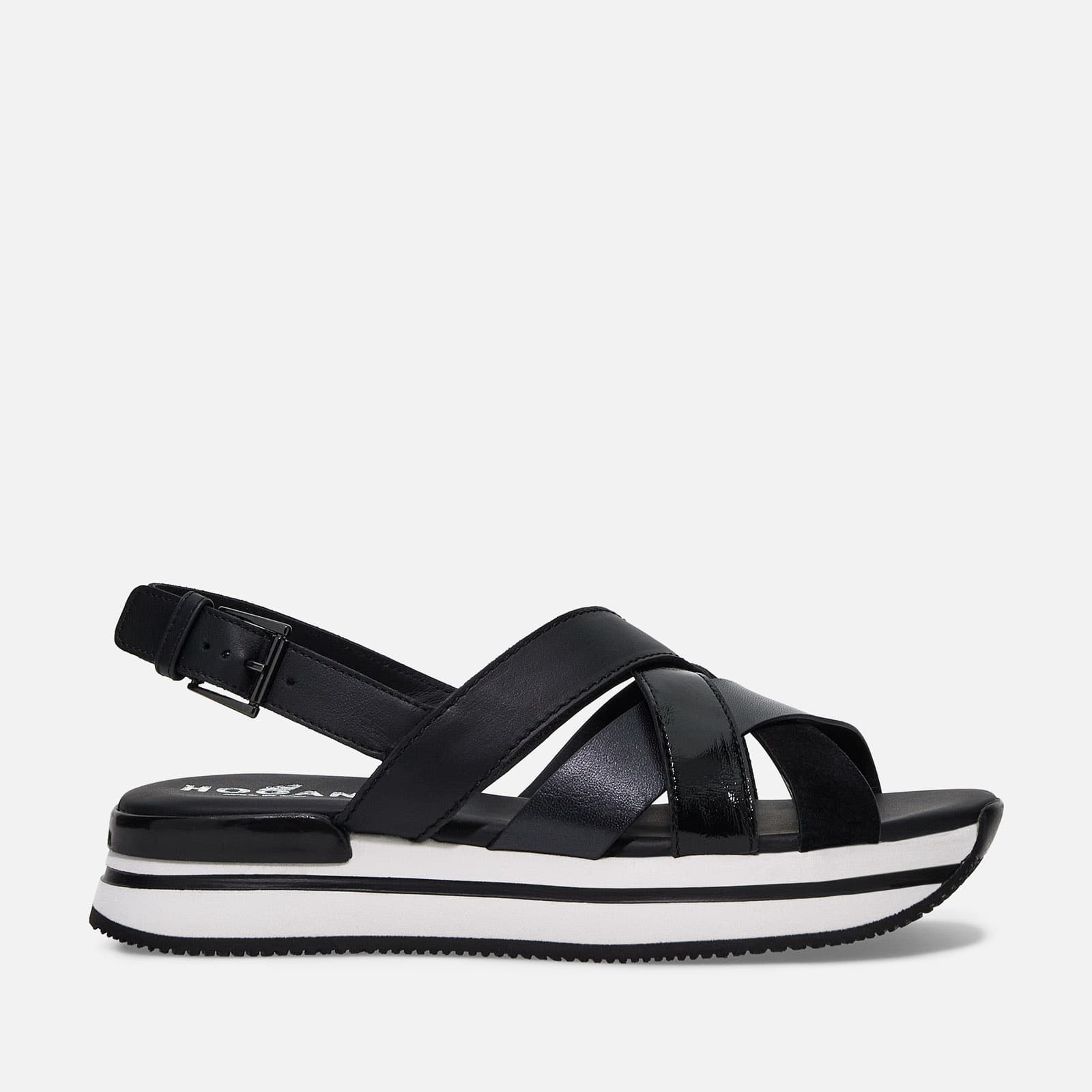 - Women's Hogan H222 Crossed Sandals - Made in Italy - Smooth leather upper - Pearly finish detailing - Patent leather and suede inserts - Adjustable heel strap - Leather insole - Ultralight eva outsole - Total height 2 ins - Maintenance and care cards included - Branded dustbag included Summer interpretation of the iconic sneakers, these strappy sandals are a real summer essential. Crafted in a mix of different types of leather, they'll enhance your silhouette in any outfit, adding a sporty-chic and feminine note to your look. MOD. HXW2570DK80R0RB999