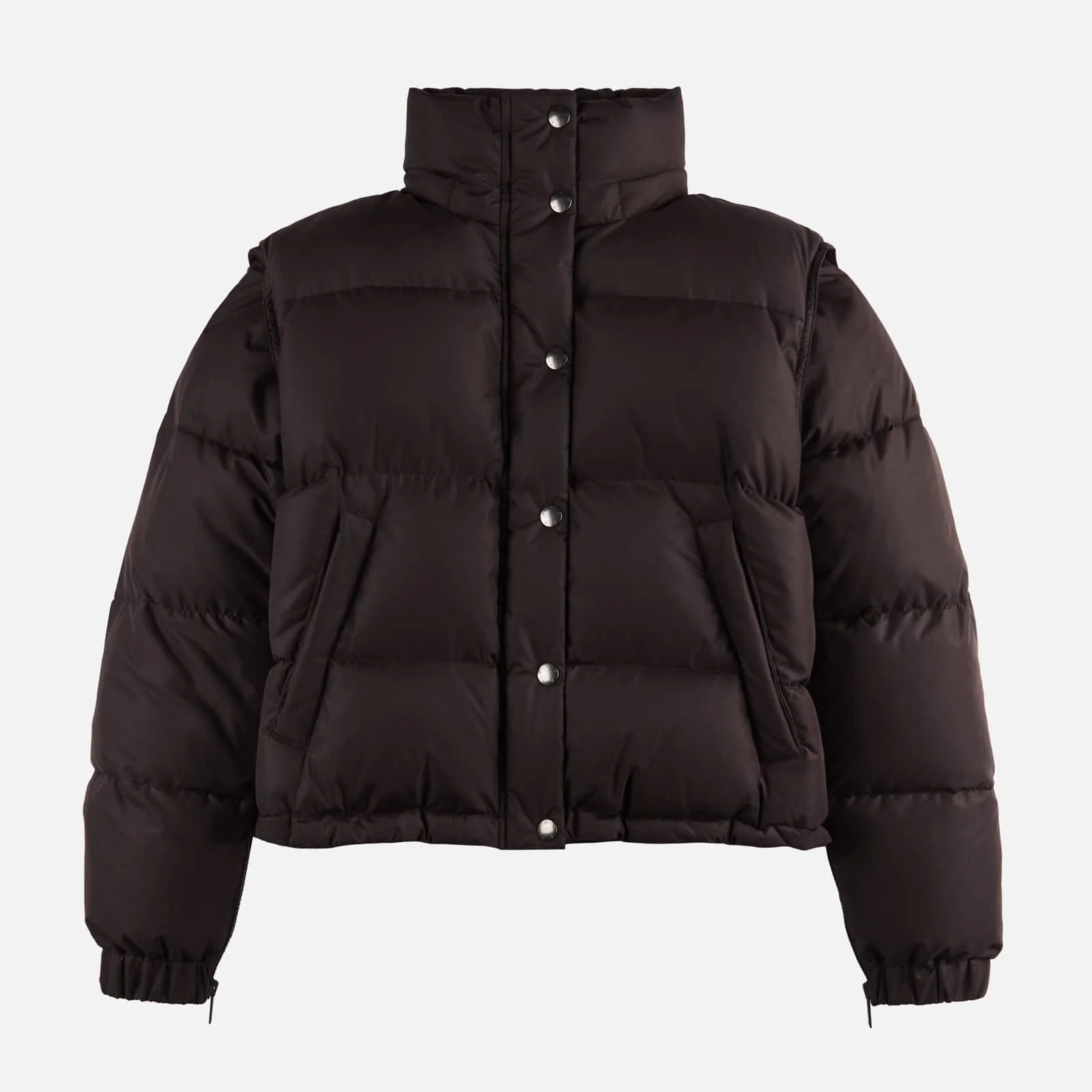 - Women's Hogan Down Jacket - Fitting: over - Item composition: 100% polyester, lining 100% polyester, leather detailing, padding 90% down, 10% feathers, class I feathers - Maintenance and care cards included Over down jacket in peach hand effect water-repellent microfiber, fastened with concealed zip and snaps. Featuring detachable sleeves, with zip on the cuffs, it comes with a concealed hood and leather tag on the back with brand's address. A warm and comfortable urban garment, with versatile use.