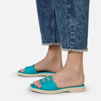 - Low Sandals - Made in Italy - Leather upper - Hogan logo stamped on the front - Leather insole - Light rubber outsole - Cord piping - Maintenance and care cards included - Fabric dustbag included True summer passe-partout, these sandals in leather feature a design that recalls the H accessory from the Hogan H-Bag line. Enhanced by the logo embossed on the front, they come with a light rubber outsole trimmed with a refined artisanal taste drawstring. MOD. HXW6380EV00LE9T204