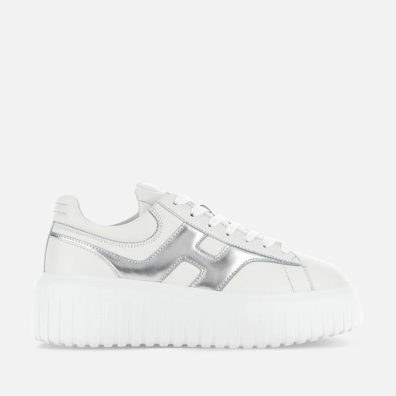 - Women's Hogan H-Stripes Sneakers - Made in Italy - Nappa leather upper - Metallic leather side H - Memory foam insole 0.3 ins - EVA outsole - Total height 2.3 ins - Maintenance and care cards included - Fabric dustbag included - Additional laces included Style with sporty and versatile lines, the H-Stripes sneakers feature an extralight outsole with vertical stripes. The upper, with a compact and balanced design, is characterized by the metallic leather H that extends across the side. The upper trim, featuring stitching on the back patch, comes with a soft padding. This version is crafted in nappa leather, with a memory foam insole that guarantees comfortable cushioning.