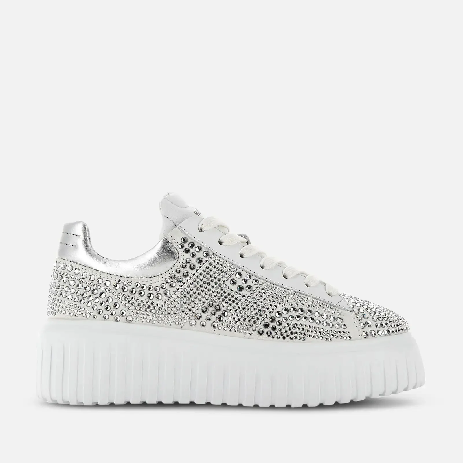 - Women's Hogan Atelier H-Stripes Sneakers - Made in Italy - Suede upper - Smooth leather inserts - Applied crystals - Crystal side H - Memory foam insole 0.3 ins - EVA outsole - Total height 2.3 ins - Maintenance and care cards included - Fabric dustbag included - Additional laces included As a result of careful and patient craftsmanship, the Hogan Atelier H-Stripes sneakers come with a pavé of more than two thousand crystals. Featuring the characteristic extralight outsole with vertical stripes, they come with a suede upper, with smooth leather inserts and padded detailing. The side H shape extends across the side, while the memory foam insole guarantees comfortable cushioning to this exclusive and precious style.