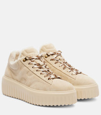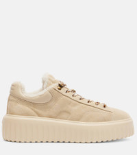 Step into the world of Hogan, the Italian brand that blurs the boundaries between formal and informal footwear. Made from supple suede, this iteration of the H-Stripes platform sneakers comes with a warm shearling lining. Product Details - Upper: lamb leather (suede) - Lining: shearling - Sole: shearling insole, rubber sole - Toe shape: round toe - Made in Italy - Includes: shoe box, dust bag, extra laces - Designer color name: Biscotti - Item color: beige - Trim: shearling - Closure: lace-up - Item number: P01118544 Size & Fit - True to size - For narrow feet, we recommend trying a half size smaller - European sizes - 4cm-1.5" platform (size EU 38) - 6cm-2.5" wedge heel (size EU 38)
