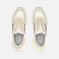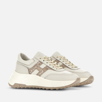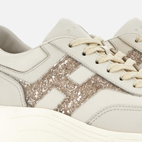 - Women's Hogan Hi-Fi Sneakers - Made in Italy - Nappa and smooth leather upper - Glitter fabric side H - Memory foam insole 0.3 ins - Rubber outsole - Total height 2.6 ins - Maintenance and care cards included - Fabric dustbag included - Additional laces included The Hogan Hi-Fi sneakers take a feminine twist on the studded Hyperlight outsole, with a raised platform for height and elegance. Recalling the 80s sporting iconography with their technical finishing and urban vocation, they feature a combination of soft and snappy lines. The upper comes here crafted in soft nappa and smooth leather, with a maxi side H in glitter fabric. An energetic athleisure style, with a memory foam insole to guarantee extra comfort and a cushioned fit.