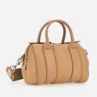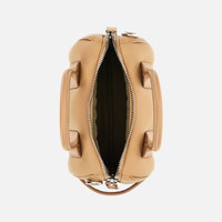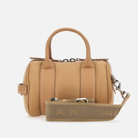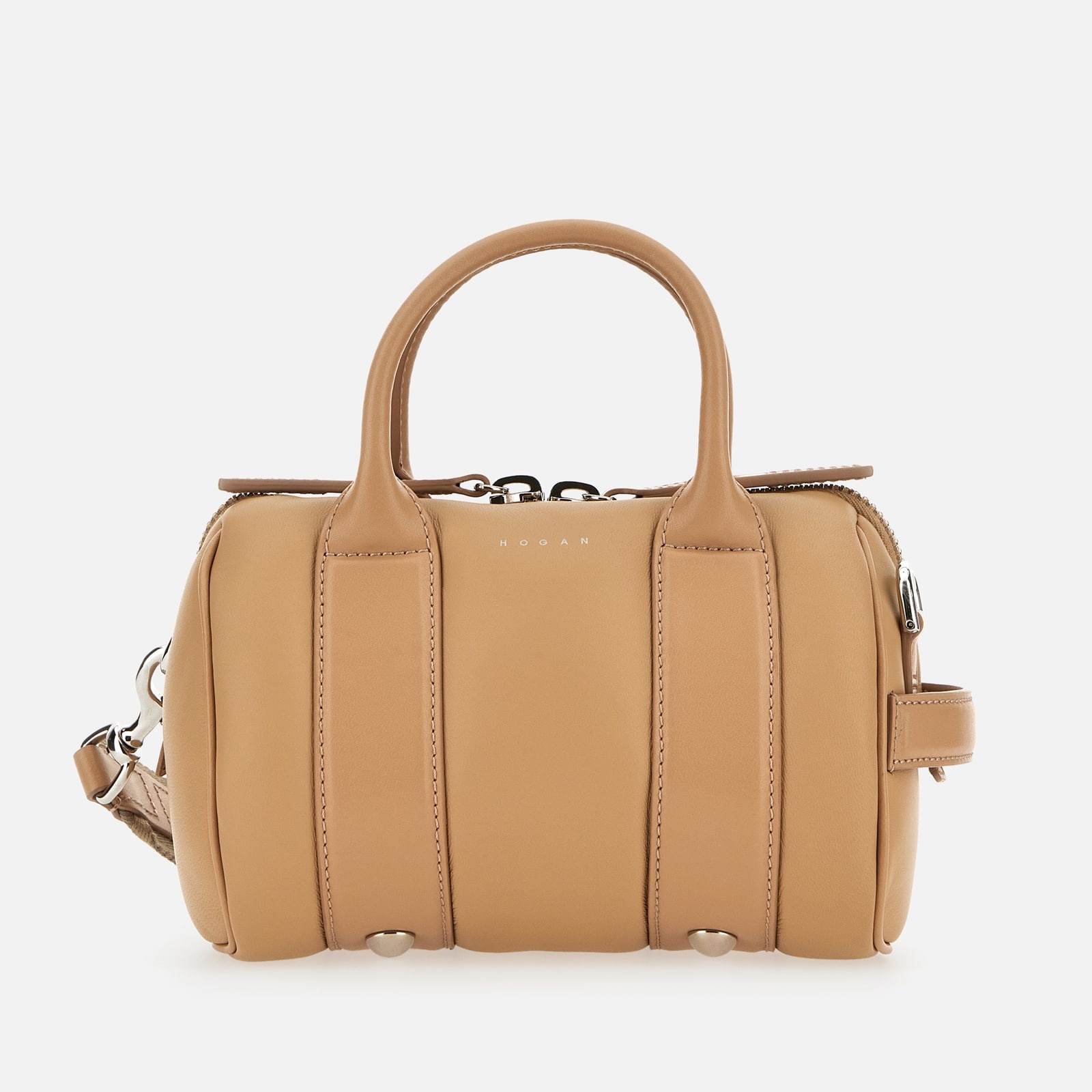 - Mini bowling bag - Item crafted in nappa leather - Hogan logo stamped on the front - Dimensions: 7.3 x 5.1 x 3.9 ins - Fixed handles - Adjustable and removable shoulder strap in fabric - Side handle - Double-slider zip closure - Cotton lining - Metal feet - Maintenance and care cards included - Fabric dustbag included Characterized by tubular handles that seem to wrap around the body of the bag, the Hogan Bam Bam mini bowling bag comes with a removable shoulder strap in jacquard branded fabric. Crafted in nappa leather, it features the Hogan logo stamped on the front, and a side handle inspired by classic boot bags. Closed with a zip and two maxi zip pulls with H-stitching, it expresses a dynamic and easy-going taste.