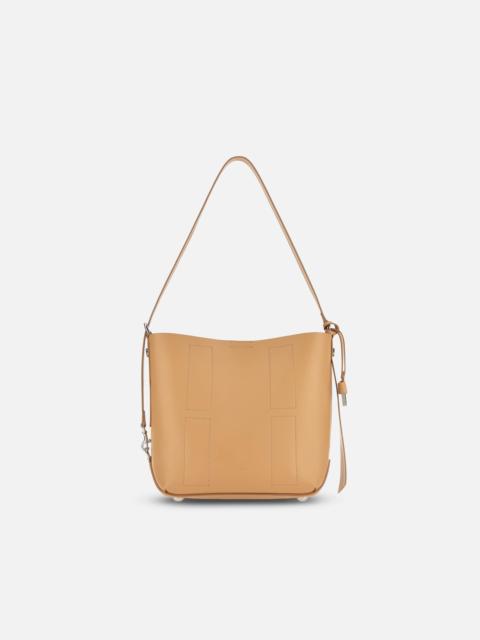 - Women's hobo bag - Item crafted in leather - Hogan logo stamped on the front and side - H charm pendant - Dimensions: 11 x 10.2 x 4.3 ins - Adjustable versatile shoulder strap - Magnetic button closure - Internal removable pouch - Metal feet - Maintenance and care cards included - Fabric dustbag included Finished with distinctive stitching outlining a maxi H, this rectangular hobo bag features the Hogan logo stamped on the front and a metal H charm on the side, covered in leather. Crafted in soft leather, it can be worn in versatile ways: crossbody, over the shoulder in a classic way, sideways as a bucket bag effect, or by hand and under the arm, folded up. A creation with an ever-changing twist, complemented by a practical pouch.