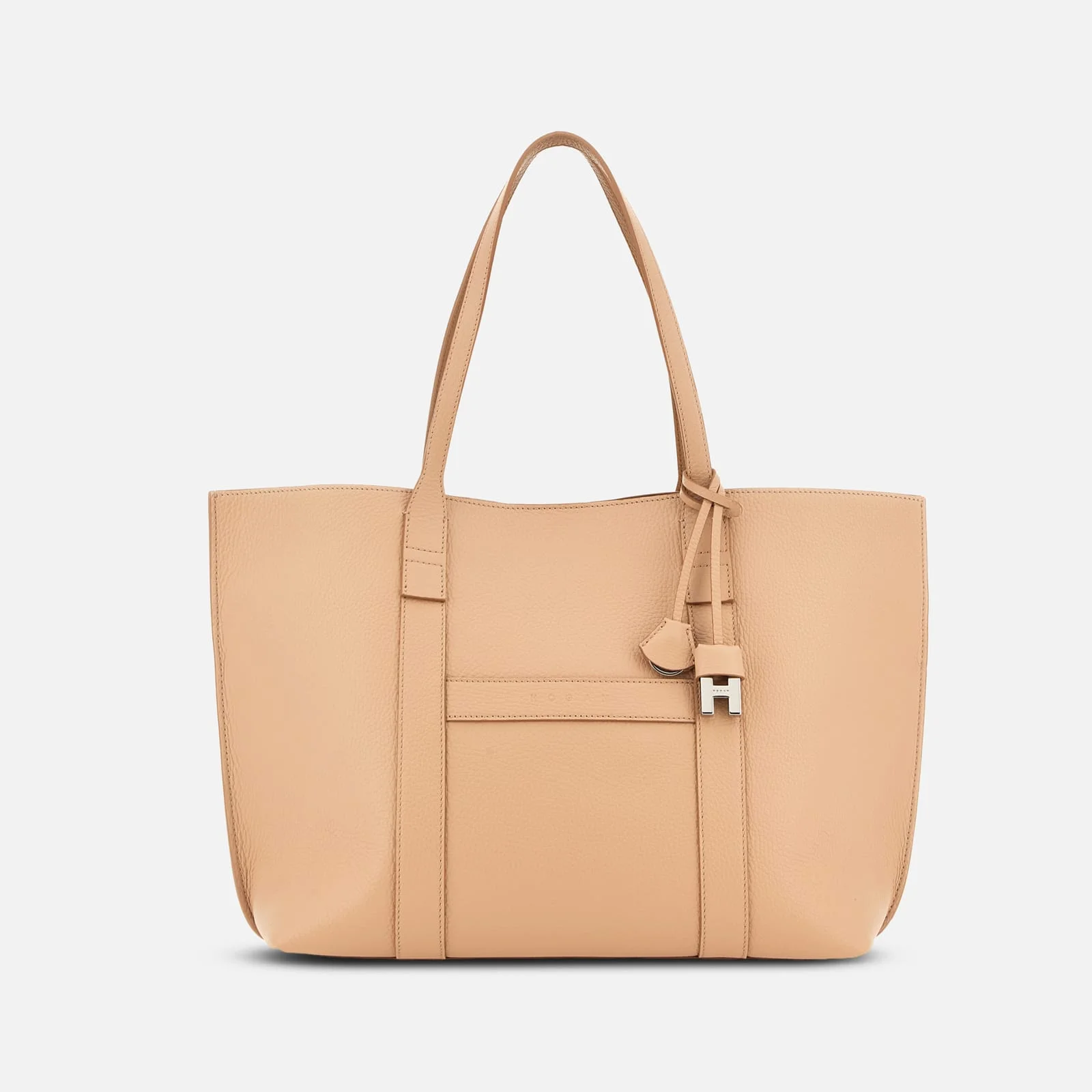 - Women's shopping bag - Item crafted in leather - Stamped Hogan logo - Dimensions: 18.1 x 10.6 x 6.1 ins - Fixed handles - Magnetic button closure - Removable zipped pouch - Maintenance and care cards included - Fabric dustbag included The Script shopping bag in a medium size, with bands on the front to form a maxi H. Featuring two fixed handles, this bag in hammered leather comes with a metal H-Fob charm and key holder pendant. The internal compartment, closed with magnetic button, features a wide central removable zipped pouch.