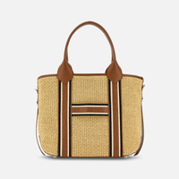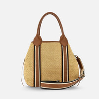 - Unisex shopping bag - Item crafted in raffia and leather - Dimensions: 11 x 13.4 x 5.5 ins - Fixed handles, adjustable and removable shoulder strap - Hogan logo stamped on the sides - Cotton lining - Internal zipped pocket - Metal feet - Maintenance and care cards included - Fabric dustbag included A reinterpretation of the signature Hogan Script design, this unisex tote is characterized by fabric and leather webbing that forms a maxi H. Crafted in raffia, it features an adjustable compartment with strap and snap.