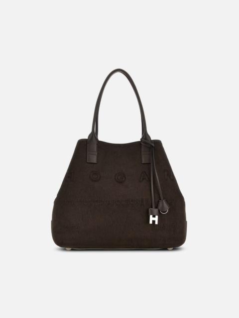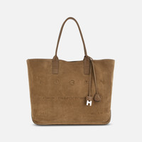 - Women's shopping bag - Item crafted in suede - Smooth leather inserts - Embossed Via Monte Napoleone address logo - Coated metal H pendant - Pendant with coated key ring - Dimensions: 19.7 x 11.8 x 6.1 ins - Fixed handles - Adjustable lace closure - Removable internal pouch - Metal feet - Maintenance and care cards included - Fabric dustbag included Lighter and more relaxed upgrade of the Hogan Script shopping bag, with the iconic brand address stamped in relief. Characterized by thinner handles in smooth leather and a wide adjustable compartment with slim straps, it is crafted in suede. Featuring an internal pouch, it is enhanced by a keyholder and metal H-Fob pendant. Perfect for the everyday urban look.