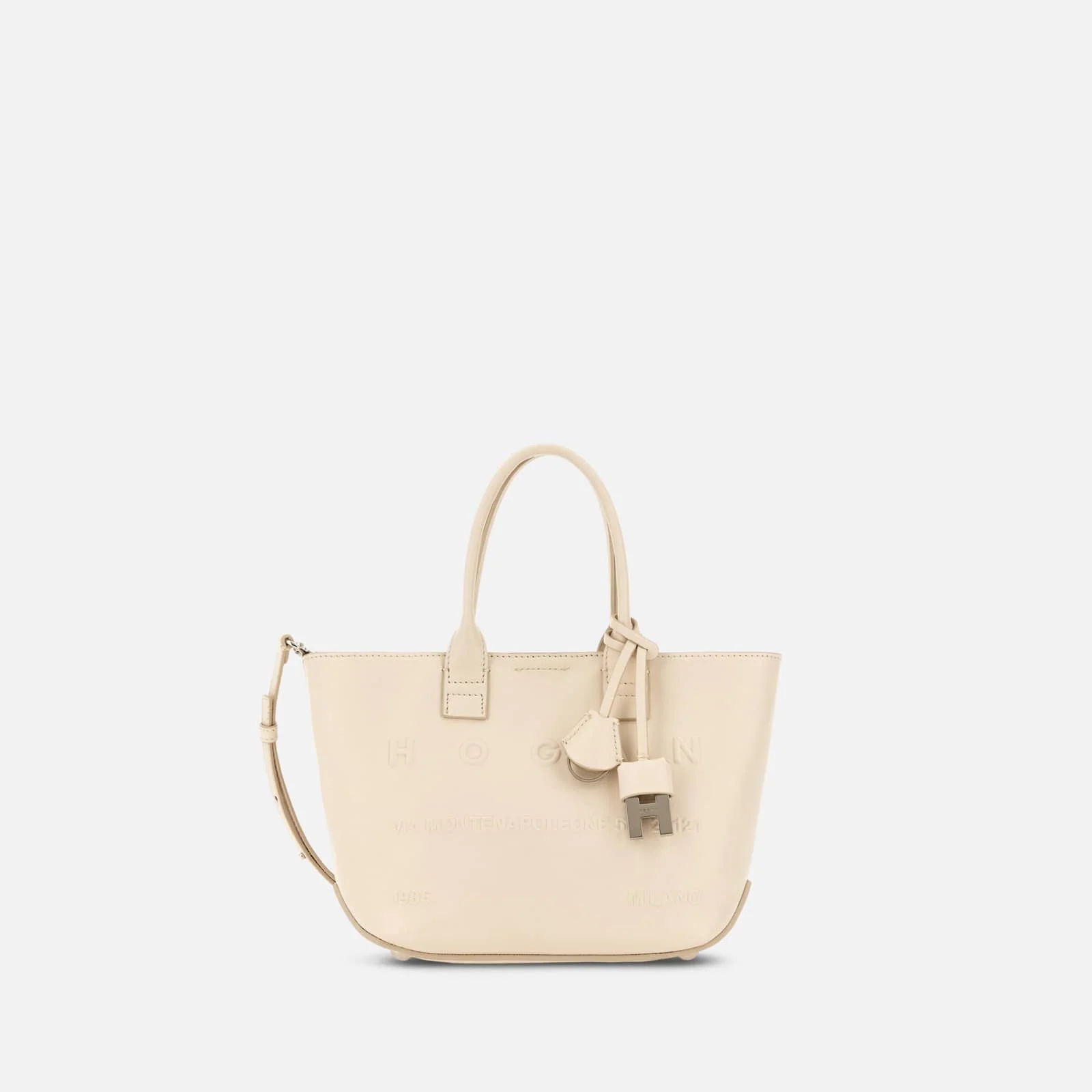 - Women's shopping bag - Item crafted in leather - Embossed Via Monte Napoleone address logo - Dimensions: 9.1 x 6.7 x 3.1 ins - Fixed handles - Adjustable and removable shoulder strap - Magnetic button closure - Removable zipped pouch - Metal feet - Maintenance and care cards included - Fabric dustbag included The distinctive shopping bag with the brand's address is revisited with the high-frequency technique. Featuring the embossed logo, this smooth leather version comes with two fixed handles, a detachable shoulder strap and internal removable pouch. A key holder pendant and the metal H-Fob charm complement the style.