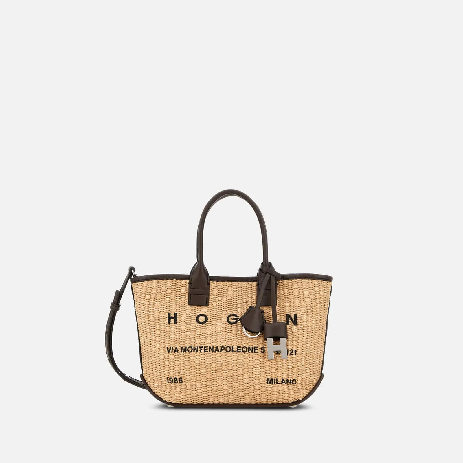 - Women's shopping bag - Item crafted in raffia - Smooth leather inserts - Printed Via Monte Napoleone address logo - Dimensions: 9.1 x 6.7 x 3.1 ins - Fixed handles - Adjustable and removable shoulder strap - Magnetic button closure - Internal zipped pocket - Metal feet - Maintenance and care cards included - Fabric dustbag included The distinctive shopping bag with the brand's address comes here in a lightweight version, with a summer mood. Featuring the printed logo, this declination in canvas comes with two fixed handles and a removable shoulder strap in leather. A key holder pendant and the metal H-Fob charm complement the style.