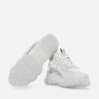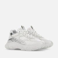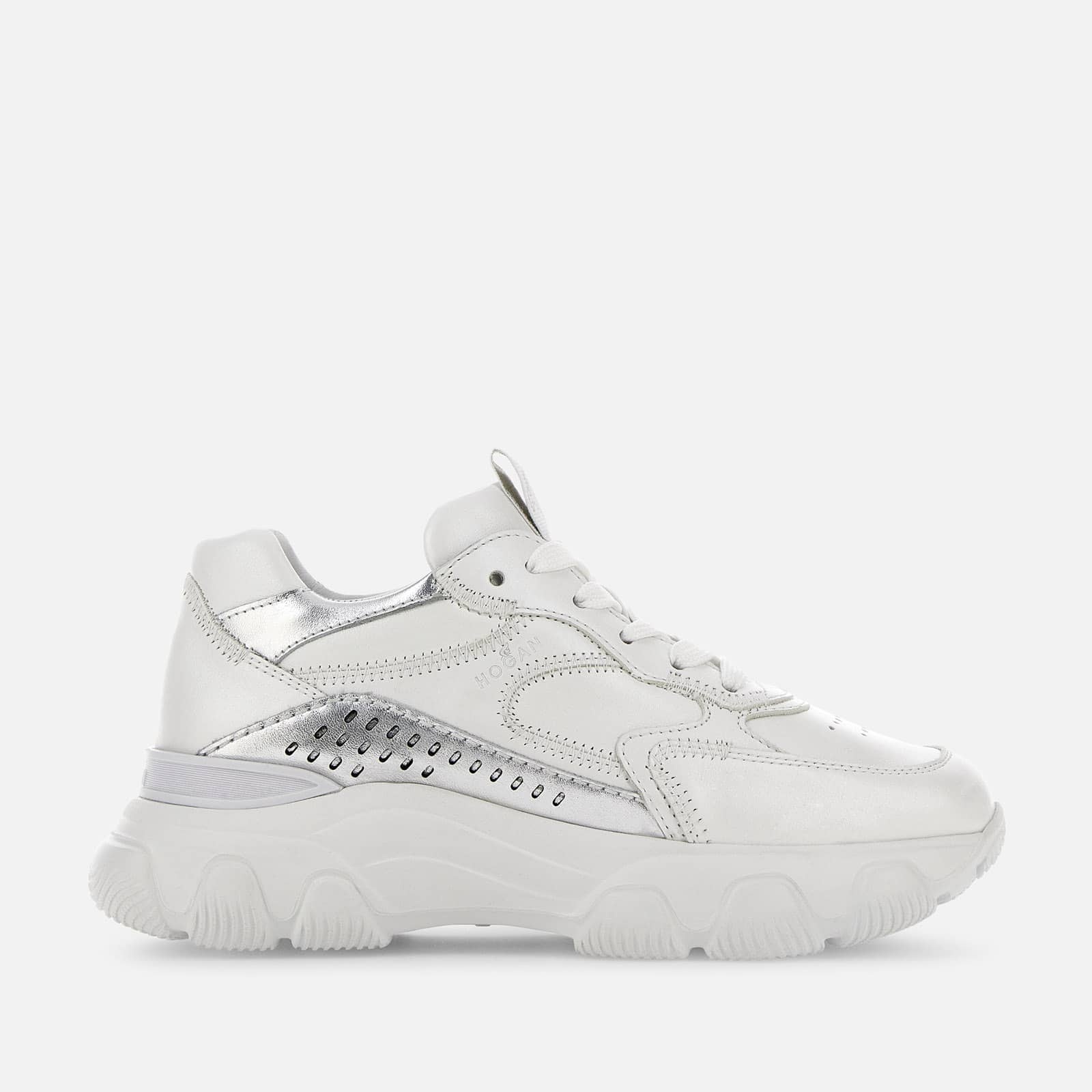- Women's Hogan Hyperactive Sneakers - Made in Italy - Smooth leather upper - Slightly metallic finish - Metallic leather inserts - Side Hogan logo - Memory foam insole 0.3 ins - Rubber outsole - Total height 2.4 ins - Maintenance and care cards included - Fabric dustbag included These women's luxury Hogan Hyperactive sneakers are a dynamic combination of contemporary inspiration and heritage detailing. The extra-light chunky outsole features a sleek trim perfectly blending with those of the upper. Crafted in metallic-effect smooth leather, with perforations and zig-zag stitching, they feature the Hogan logo stamped on the side and a memory foam insole. The new star of the urban lifestyle. MOD. HXW5400DQ01NOU0351