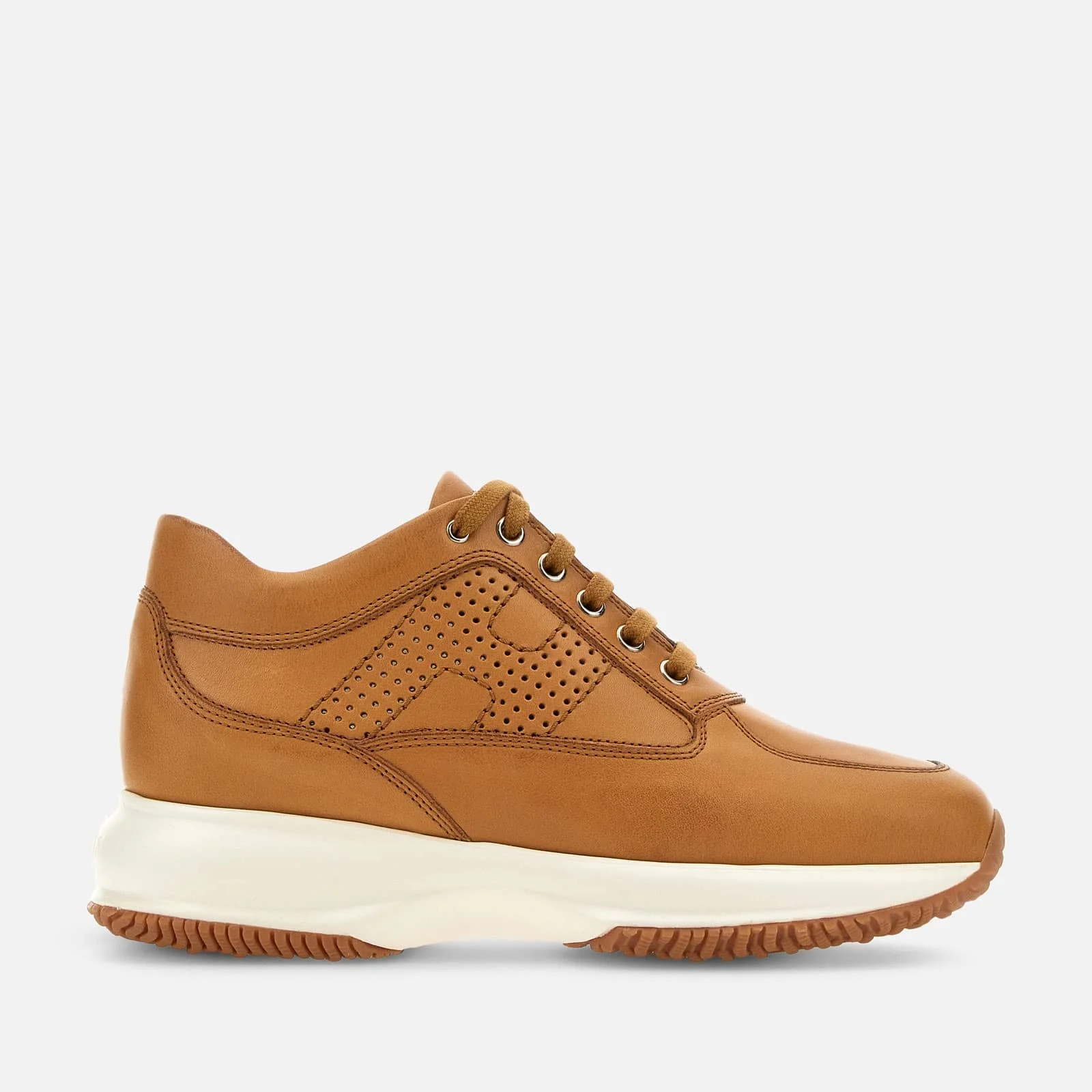 - Women's Hogan Interactive Sneakers - Made in Italy - Leather upper - Perforated side H - Removable insole 0.5 ins - Rubber outsole - Total height 2.2 ins - Maintenance and care cards included - Fabric dustbag included Hogan Interactive is a real timeless icon, characterized by an elegant design and a lightweight outsole to guarantee a tall-and-slim look. Since 1997, it has been renewed with every collection, remaining the absolute interpreter of functional and contemporary luxury. These women's sneakers in smooth leather come with a perforated side H. A refined style with a fresh mood, perfect for the spring-summer season. MOD. HXW00N00E30KXTG608