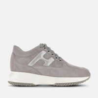 - Women's Hogan Interactive Sneakers - Made in Italy - Suede upper - Suede side H with laminated finish - Removable insole 0.5 ins - Rubber outsole - Total height 2.2 ins - Maintenance and care cards included - Fabric dustbag included - Additional laces included Hogan Interactive is a real timeless icon, characterized by an elegant design and a lightweight outsole to guarantee a tall-and-slim look. Since 1997 it gets renewed with each collection still representing an absolute functional and contemporary luxury icon. These sneakers in suede come with a side H with laminated finish. Perfect for a sporty chic look.