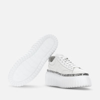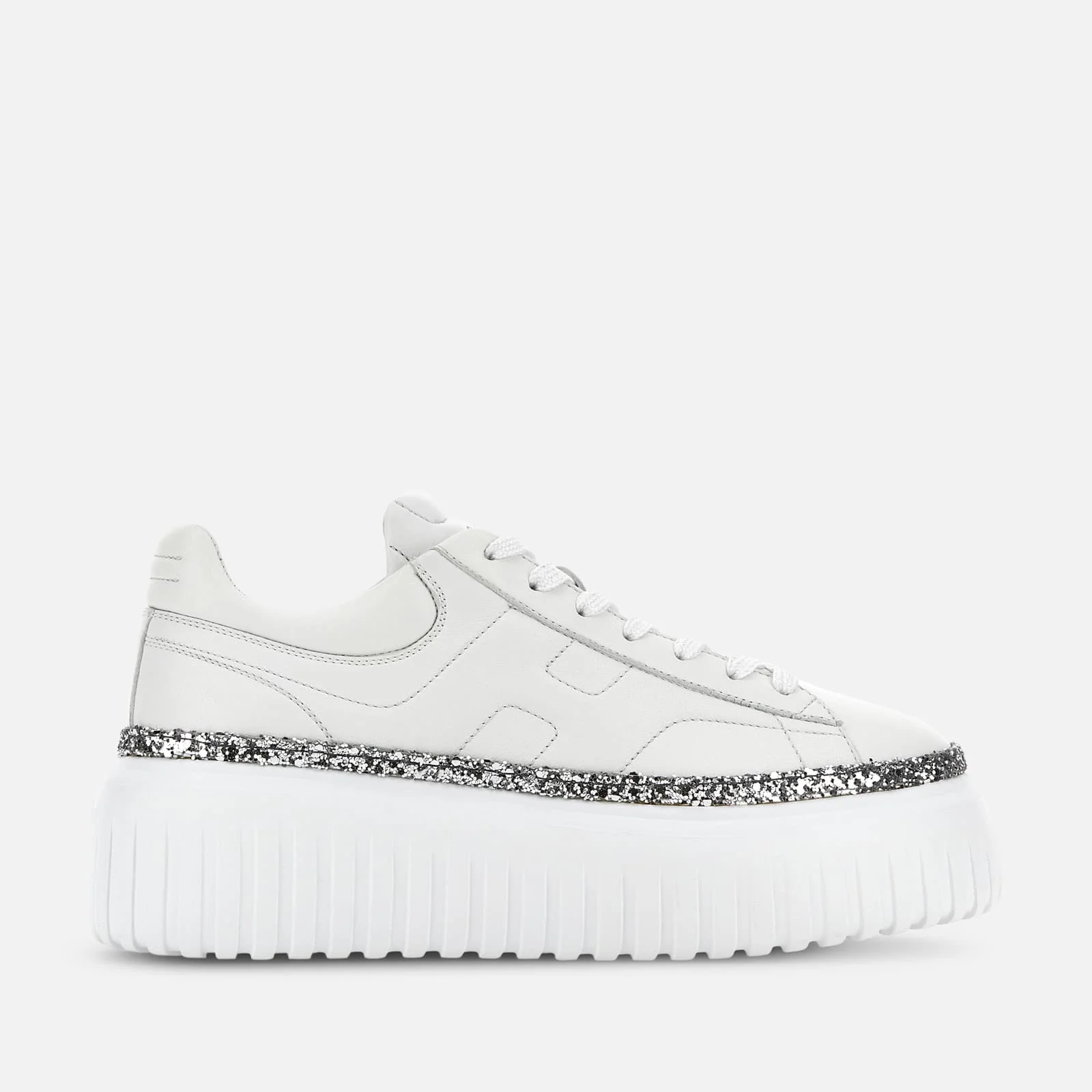 - Women's Hogan H-Stripes Sneakers - Made in Italy - Nappa leather upper - Side H - Glitter welt - Memory foam insole 0.3 ins - EVA outsole - Total height 2.3 ins - Maintenance and care cards included - Fabric dustbag included - Additional laces included A new style with sporty and versatile lines, the H-Stripes sneakers feature an extralight outsole with vertical stripes. The upper, with a compact and balanced design, is characterized by the H that extends across the side. The upper trim, featuring stitching on the back patch, comes with a soft padding. This version is crafted in nappa leather, with a glitter welt and memory foam insole that guarantees comfortable cushioning.