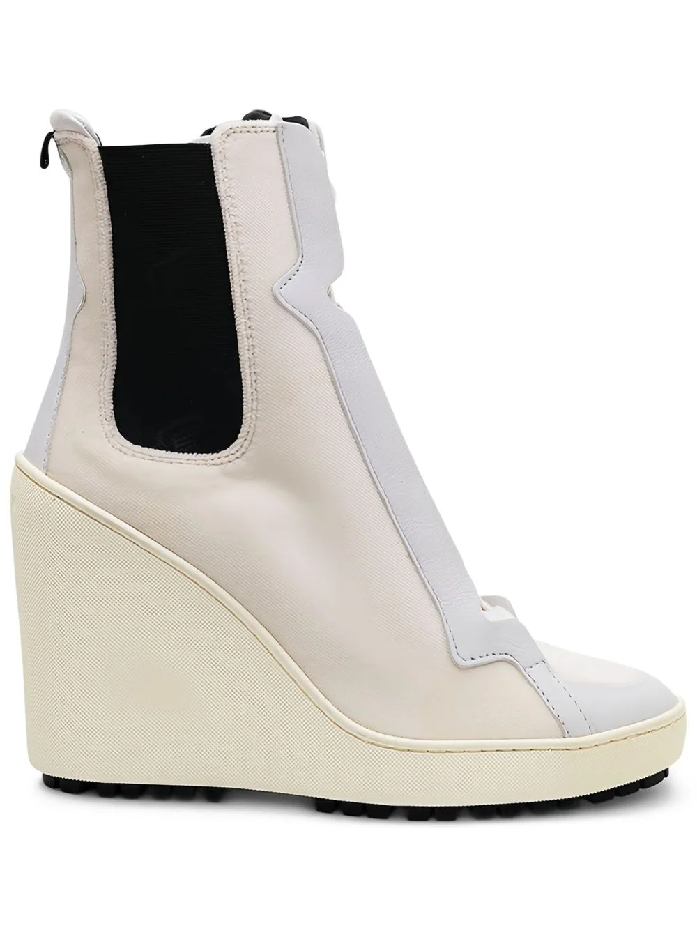 lace-up wedge ankle boots Highlights - Off-white - Wedge heel - Lace-up fastening - Elasticated gusset - Leather panelling - Rubber sole Made in Italy Composition Sole: Rubber 100% Outer: Calf Leather 100% Lining: Calf Leather 100%