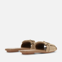 - Women's Hogan H685 Flat Sandals - Made in Italy - Suede upper - Fringes on the front - Bow with metal charm - Soft insole covered in leather - Rubber outsole - Total height 0.8 ins - Maintenance and care cards included - Fabric dustbag included The Hogan H685 flat sandals are characterized by a suede upper, with asymmetrical fringes and a bow with Hogan charm. Featuring a padded insole, they come with a lightweight rubber split outsole. An easy chic style, interpreting a relaxed elegance.