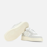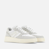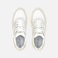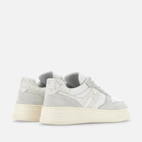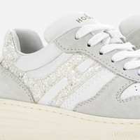 - Women's Hogan H630 Sneakers - Made in Italy - Suede upper - Smooth leather inserts - Glitter fabric side H and inserts - Nappa leather detailing - Memory foam insole 0.4 ins - Rubber outsole - Total height 1.6 ins - Maintenance and care cards included - Fabric dustbag included - Additional laces included The Hogan H630 sneakers combine lines inspired by the basketball world and classic brand style. The suede and smooth leather upper features an extended H in glitter fabric that envelopes the heel. The outsole is crafted in extralight EVA, with embossed logo on the side and shaded stripes that reinterpret the iconic Rebel grooves. Must-have for the contemporary wardrobe, this dynamic style is complemented by memory foam insole that ensures softness and cushioning.