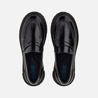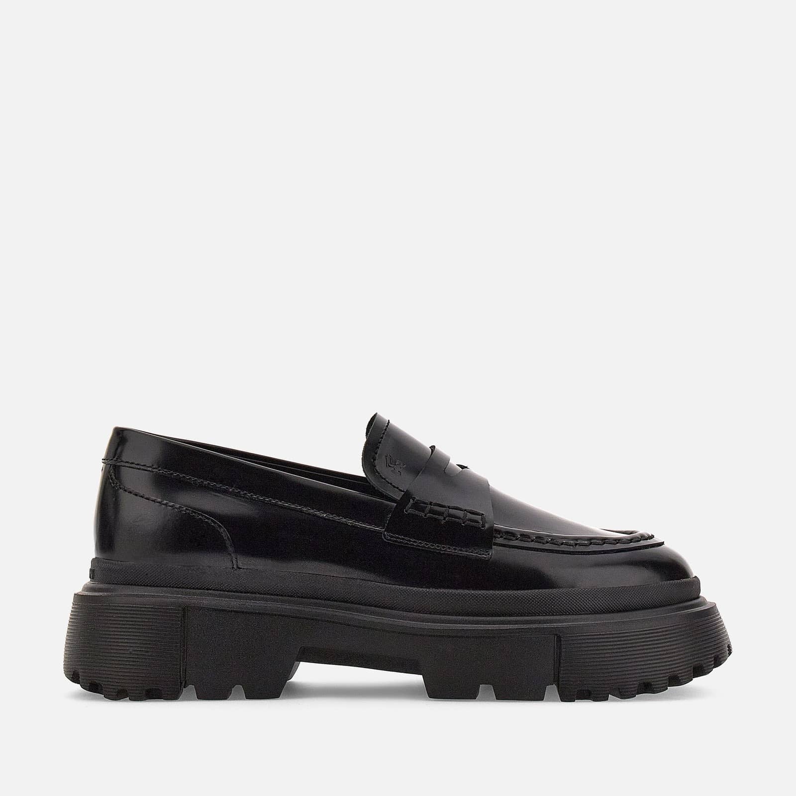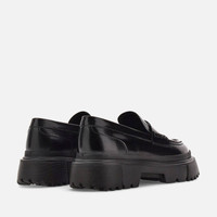 - Women's Hogan Loafers H629 - Made in Italy - Brush-off leather upper - Penny bar - Exposed stitching - Memory foam insole - EVA outsole - Maintenance and care cards included - Fabric dustbag included New must-have for contemporary urban style, these women's loafers feature a lugged outsole with milleraies detailing. Designed for optimal grip, the tread features external H-shaped blocks. The military-inspired chunky bottom, with a strong and energetic character, contrasts with the elegant lines of the brush-off leather upper, with a classic penny bar. The memory foam insole guarantees softness and comfort. MOD. HXW6290EP10RWWB999