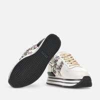 - Women's Hogan Midi H222 Sneakers - Made in Italy - Leather upper - Mirror fabric inserts - Side H with floral applications - Removable insole 0.3 ins - Ultra-light EVA outsole - Total height 2.2 ins - Maintenance and care cards included - Branded dustbag included As the result of painstaking and dedicated craftsmanship, these Midi sneakers in smooth leather with mirror inserts are characterized by refined floral applications that compose a side H. A precious style with a glam-sporty spirit, with the iconic ultra-light outsole designed to slender the silhouette. MOD. HVW4830EV10OWR024E