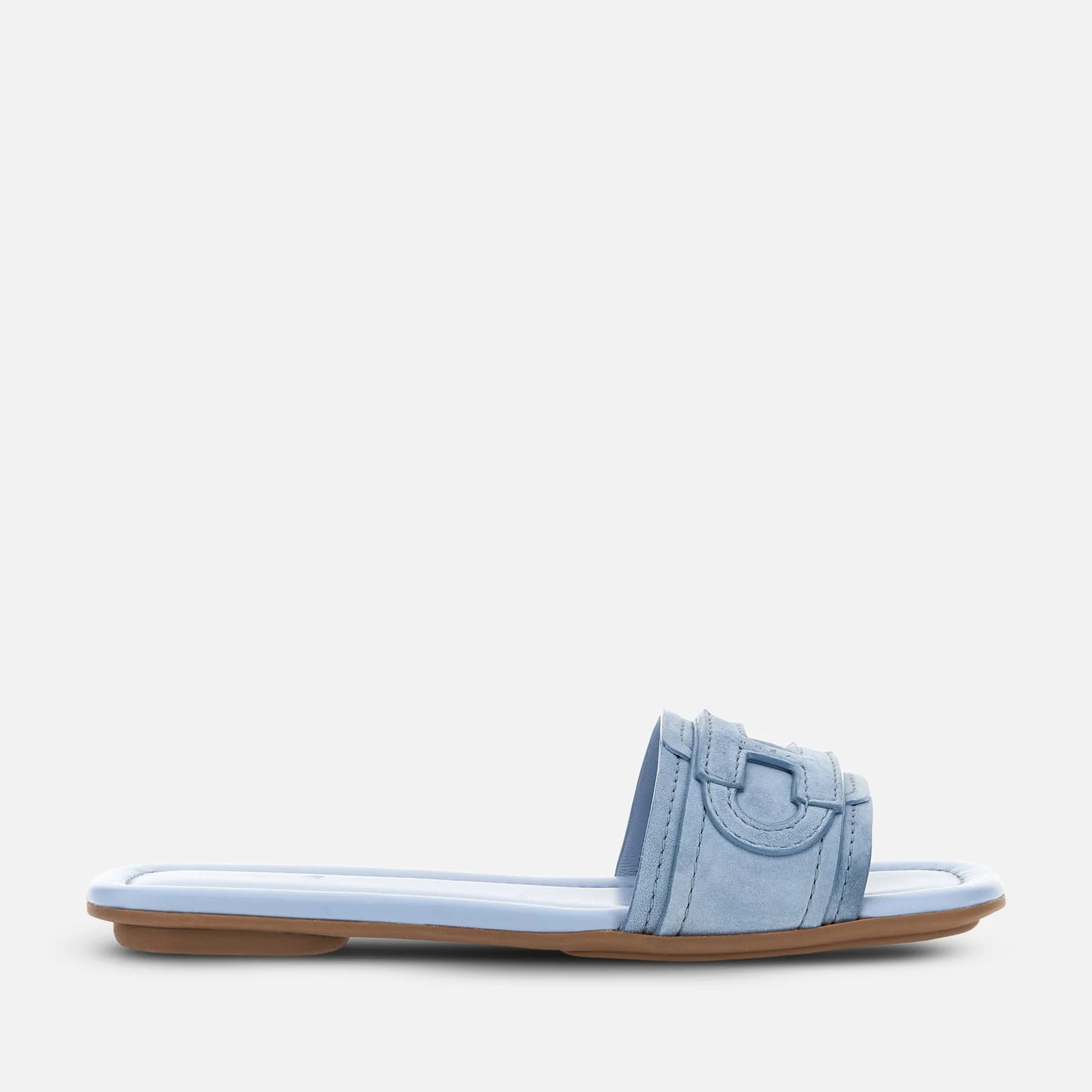 - Women's Hogan H685 Flat Sandals - Made in Italy - Suede upper - Applied H with stamped Hogan logo - Leather-covered soft insole - Rubber outsole - Total height 0.8 ins - Maintenance and care cards included - Fabric dustbag included The Hogan H685 flat sandals are characterized by a suede band, with an embossed H recalling the collection's bags. Featuring a padded insole, they come with a lightweight rubber split outsole. An easy chic style, interpreting a relaxed elegance.