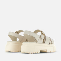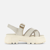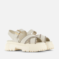 - Women's Hogan Sandals - Made in Italy - Nappa leather upper - Heel strap with buckle - Leather insole - Rubber outsole - Maintenance and care cards included - Fabric dustbag included Crafted in soft nappa leather, these sandals are characterized by crossed straps, with flat threading on the piping and heel strap. Featuring a lugged outsole with milleraies detailing, they come with a tread with external H-shaped blocks, designed for optimal grip.